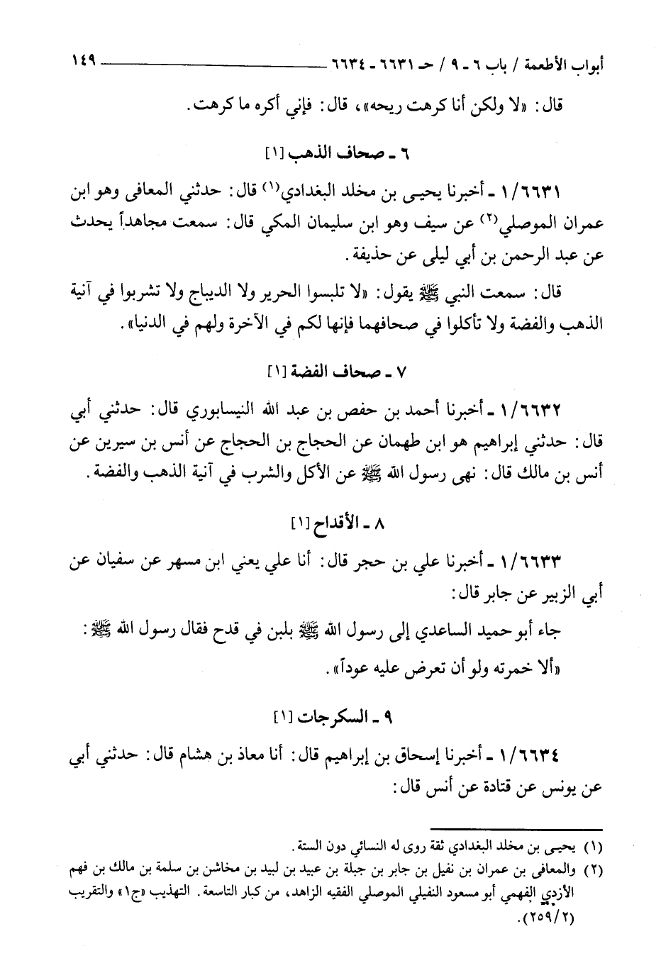 6631 - أخبرنا يحيى بن مخلد البغدادي قال حدثني المعافى وهو بن عمران الموصلي عن سيف وهو بن سليمان المكي قال سمعت مجاهدا يحدث عن عبد الرحمن بن أبي ليلى عن حذيفة قال سمعت النبي صلى الله عليه و سلم يقول : لا تلبسوا الحرير ولا الديباج ولا تشربوا في آنية الذهب والفضة ولا تأكلوا في صحافهما فإنها لكم في الآخرة ولهم في الدنيا