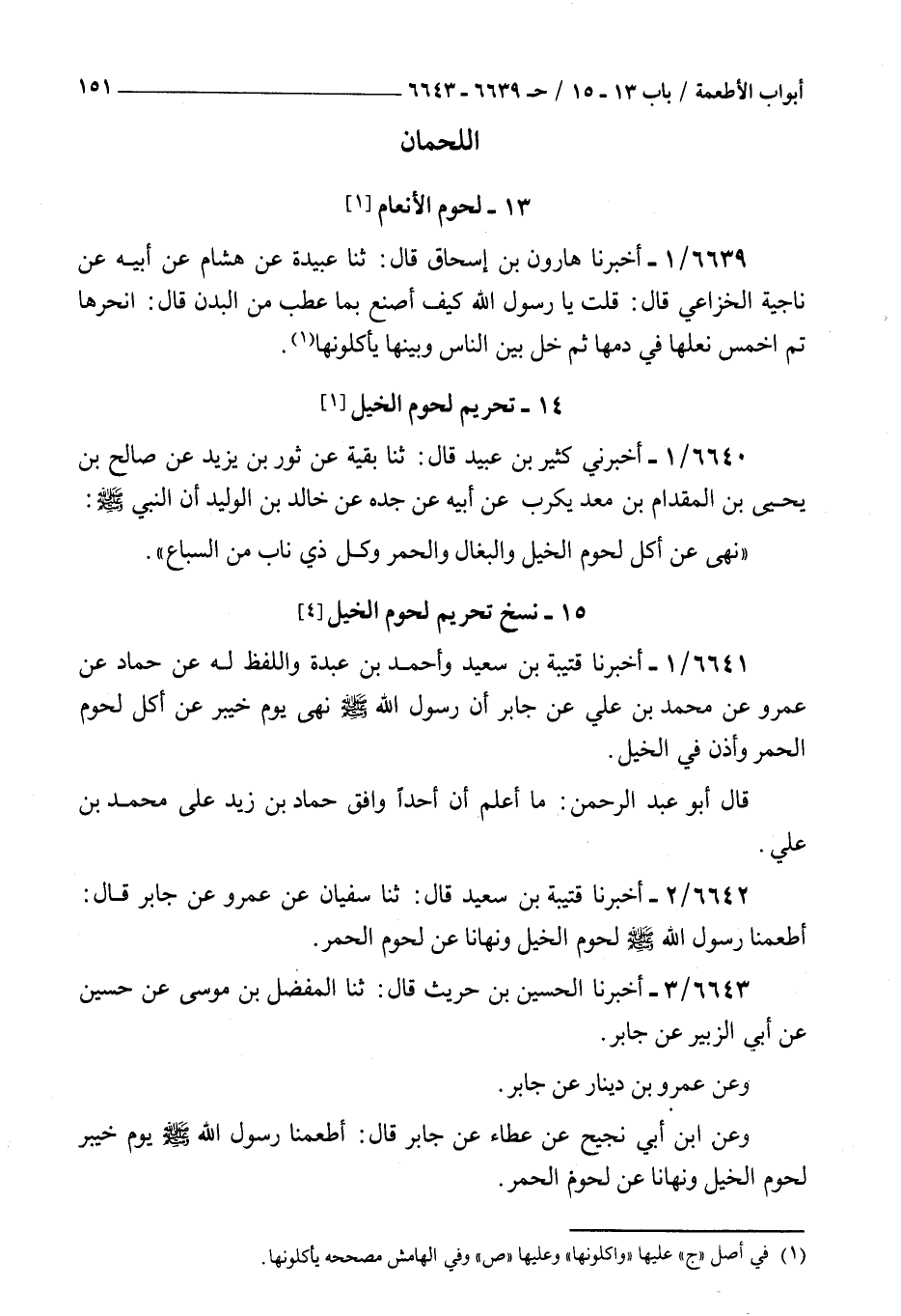 6641 - أخبرنا قتيبة بن سعيد وأحمد بن عبدة واللفظ له عن حماد عن عمرو عن محمد بن علي عن جابر : أن رسول الله صلى الله عليه و سلم نهى يوم خيبر عن أكل لحوم الحمر وأذن في الخيل قال أبو عبد الرحمن ما أعلم أن أحدا وافق حماد بن زيد على محمد بن علي