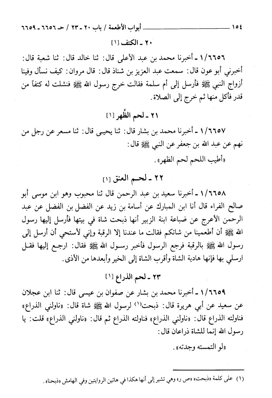 6658 - أخبرنا سعيد بن عبد الرحمن قال ثنا محبوب وهو بن موسى أبو صالح الفراء قال أنا بن المبارك عن أسامة بن زيد عن الفضل بن الفضل عن عبد الرحمن الأعرج عن ضباعة ابنة الزبير أنها : ذبحت شاة في بيتها فأرسل إليها رسول الله صلى الله عليه و سلم أن أطعمينا من شاتكم فقالت ما عندنا إلا الرقبة وإني لأستحي أن أرسل إلى رسول الله صلى الله عليه و سلم بالرقبة فرجع الرسول فأخبر رسول الله صلى الله عليه و سلم فقال ارجع إليها فقل أرسلي بها فإنها هادية الشاة وأقرب الشاة إلى الخير وأبعدها من الأذى