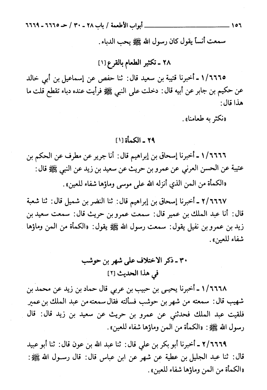 6668 - أخبرنا يحيى بن حبيب بن عربي قال حماد بن زيد عن محمد بن شهيب قال سمعته من شهر بن حوشب فسألته فقال سمعته من عبد الملك بن عمير فلقيت عبد الملك فحدثني عن عمرو بن حريث عن سعيد بن زيد قال قال رسول الله صلى الله عليه و سلم : الكمأة من المن وماؤها شفاء للعين