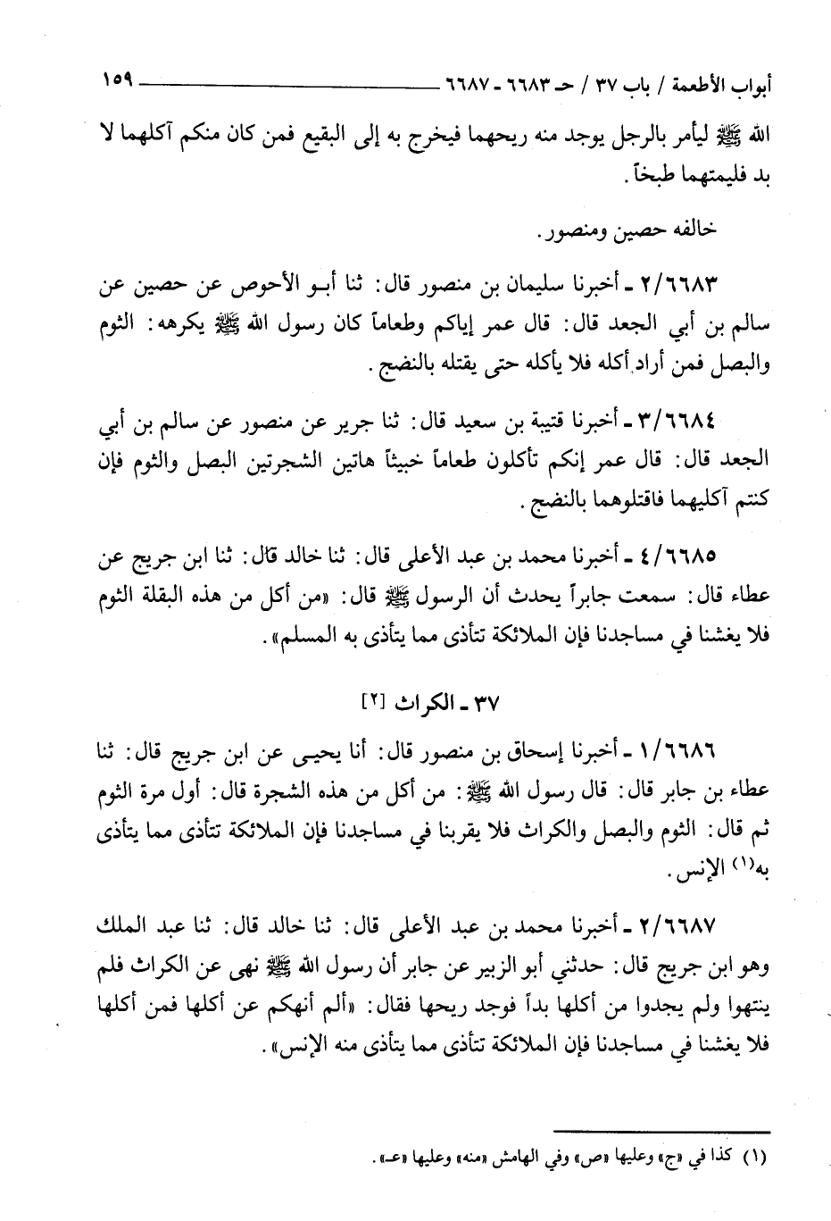 6684 - أخبرنا قتيبة بن سعيد قال ثنا جرير عن منصور عن سالم بن أبي الجعد قال قال عمر : إنكم تأكلون طعاما خبيثا هاتين الشجرتين البصل والثوم فإن كنتم آكليهما فاقتلوهما بالنضج