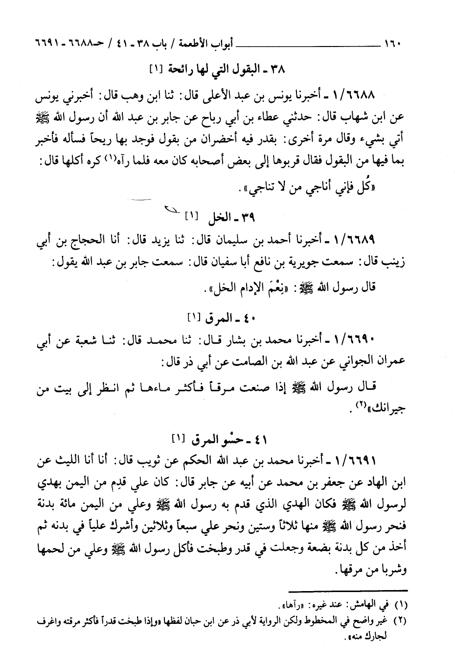 6690 - أخبرنا محمد بن بشار قال ثنا محمد قال ثنا شعبة عن أبي عمران الجواني عن عبد الله بن الصامت عن أبي ذر قال قال رسول الله صلى الله عليه و سلم : إذا صنعت مرقا فأكثر ماءها ثم انظر إلى بيت من جيرانك