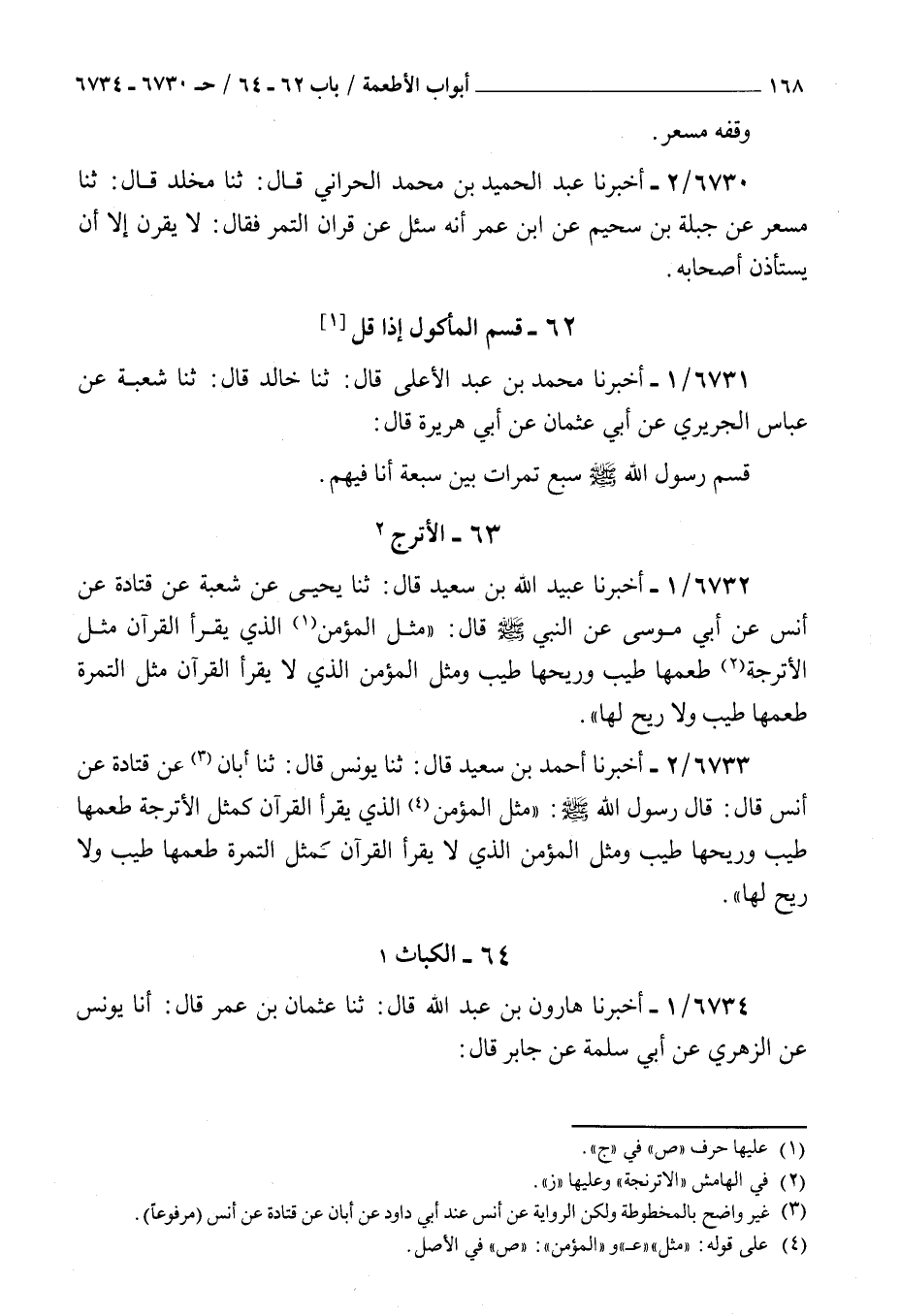 6730 - أخبرنا عبد الحميد بن محمد الحراني قال ثنا مخلد قال ثنا مسعر عن جبلة بن سحيم عن بن عمر أنه سئل عن قران التمر فقال : لا يقرن إلا أن يستأذن أصحابه
