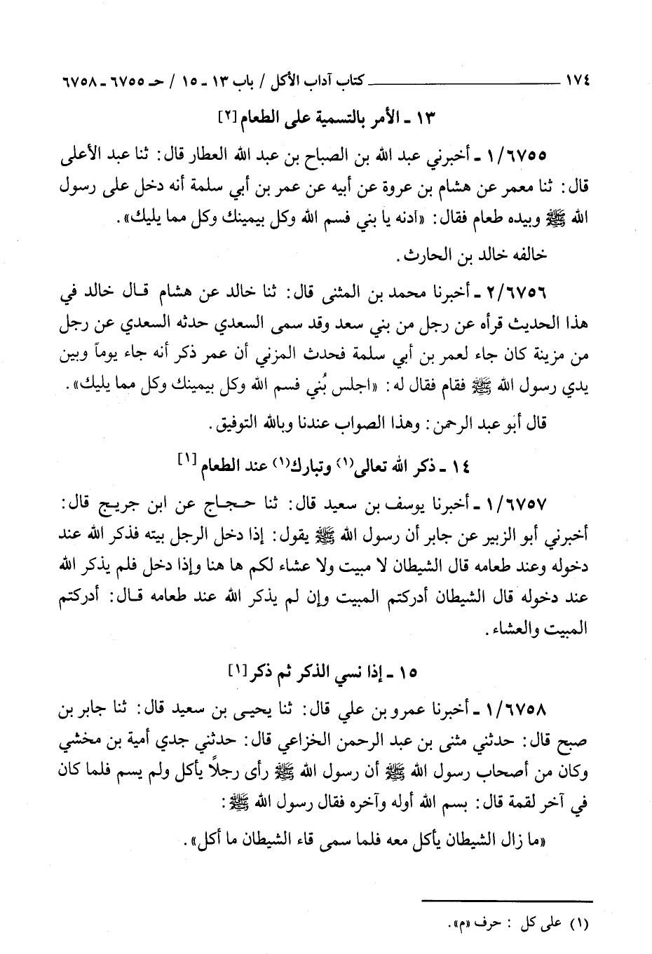 6755 - أخبرني عبد الله بن الصباح بن عبد الله العطار قال ثنا عبد الأعلى قال ثنا معمر عن هشام بن عروة عن أبيه عن عمر بن أبي سلمة أنه : دخل على رسول الله صلى الله عليه و سلم وبيده طعام فقال ادنه يا بني فسم الله وكل بيمينك وكل مما يليك خالفة خالد بن الحارث