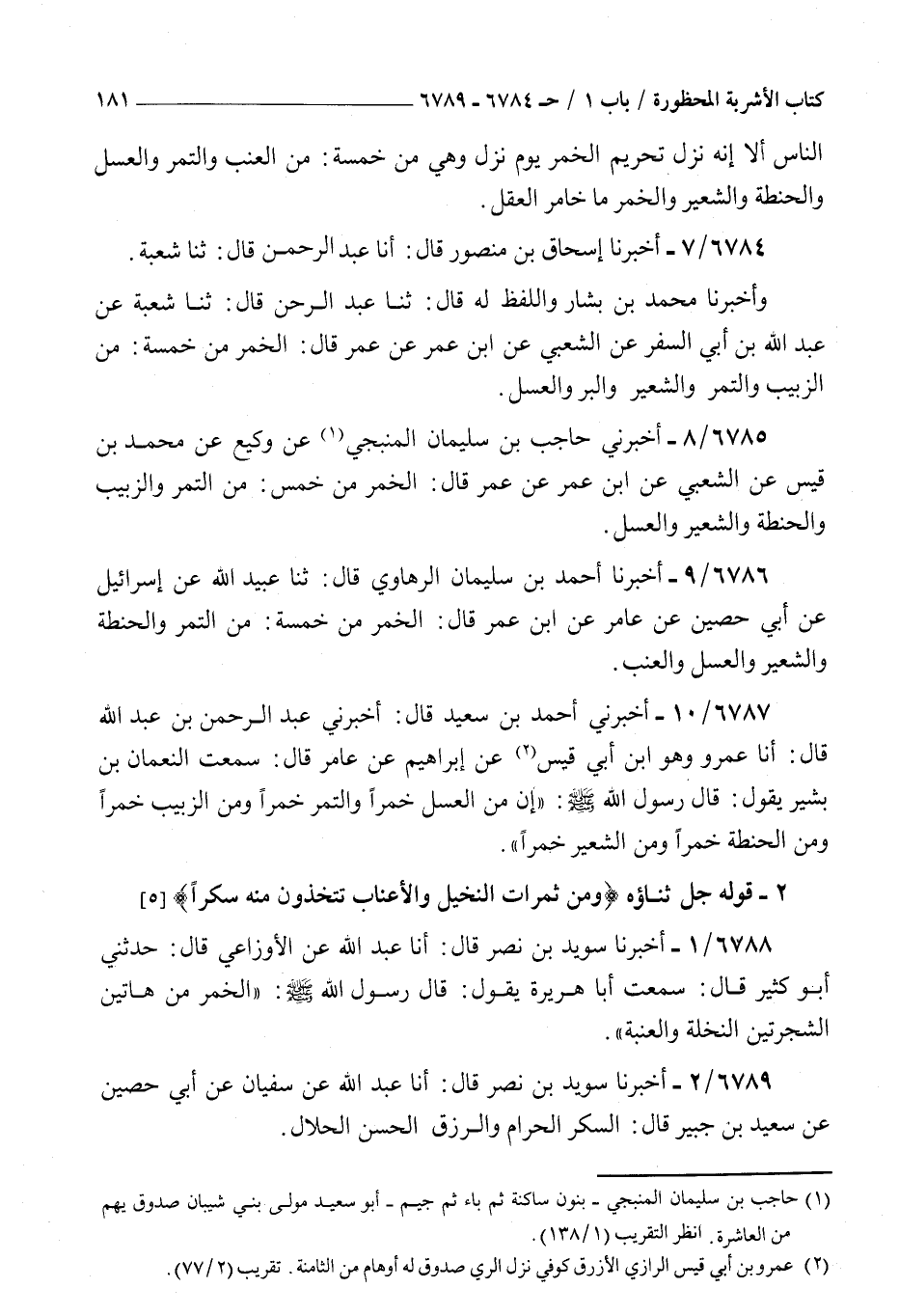 6785 - أخبرني حاجب بن سليمان المنبجي عن وكيع عن محمد بن قيس عن الشعبي عن بن عمر عن عمر قال : الخمر من خمس من التمر والزبيب والحنطة والشعير والعسل