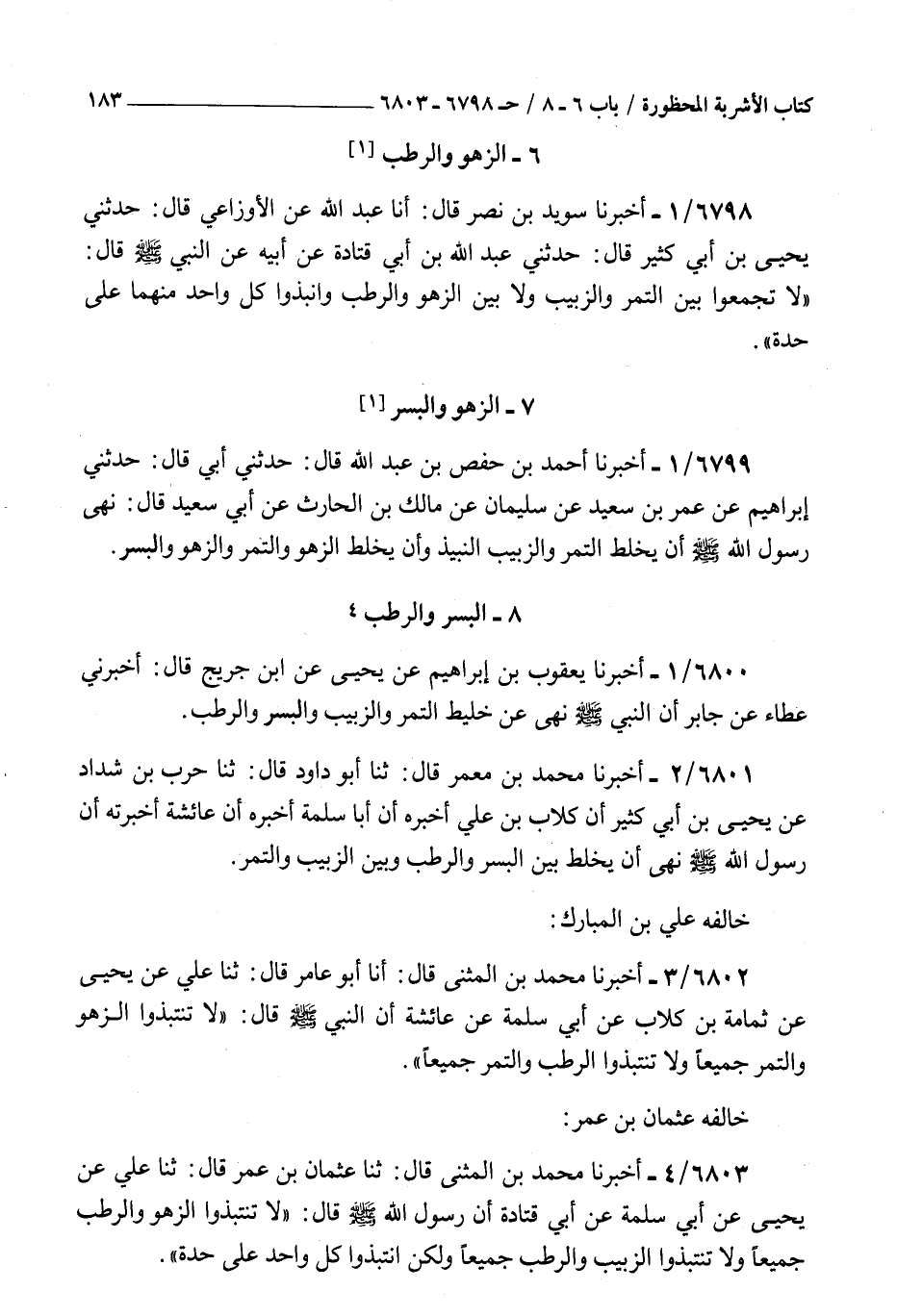 6803 - أخبرنا محمد بن المثنى قال ثنا عثمان بن عمر قال ثنا علي عن يحيى عن أبي سلمة عن أبي قتادة أن رسول الله صلى الله عليه و سلم قال : لا تنتبذوا الزهو والرطب جميعا ولا تنتبذوا الزبيب والرطب جميعا ولكن انتبذوا كل واحد على حدة