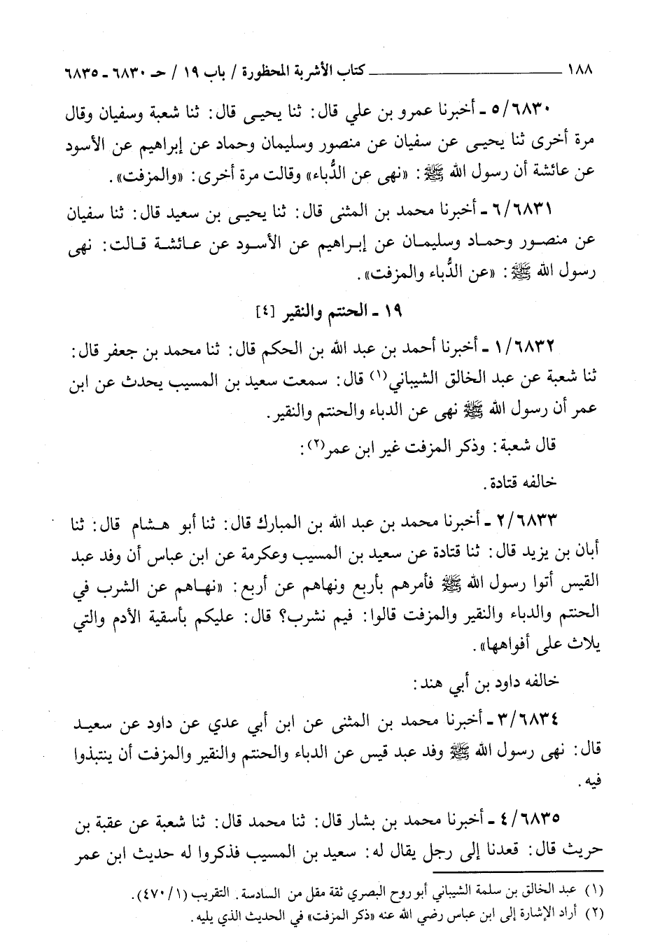 6832 - أخبرنا أحمد بن عبد الله بن الحكم قال ثنا محمد بن جعفر قال ثنا شعبة عن عبد الخالق الشيباني قال سمعت سعيد بن المسيب يحدث عن بن عمر : أن رسول الله صلى الله عليه و سلم نهى عن الدباء والحنتم والنقير قال شعبة وذكر المزفت غير بن عمر خالفة قتادة