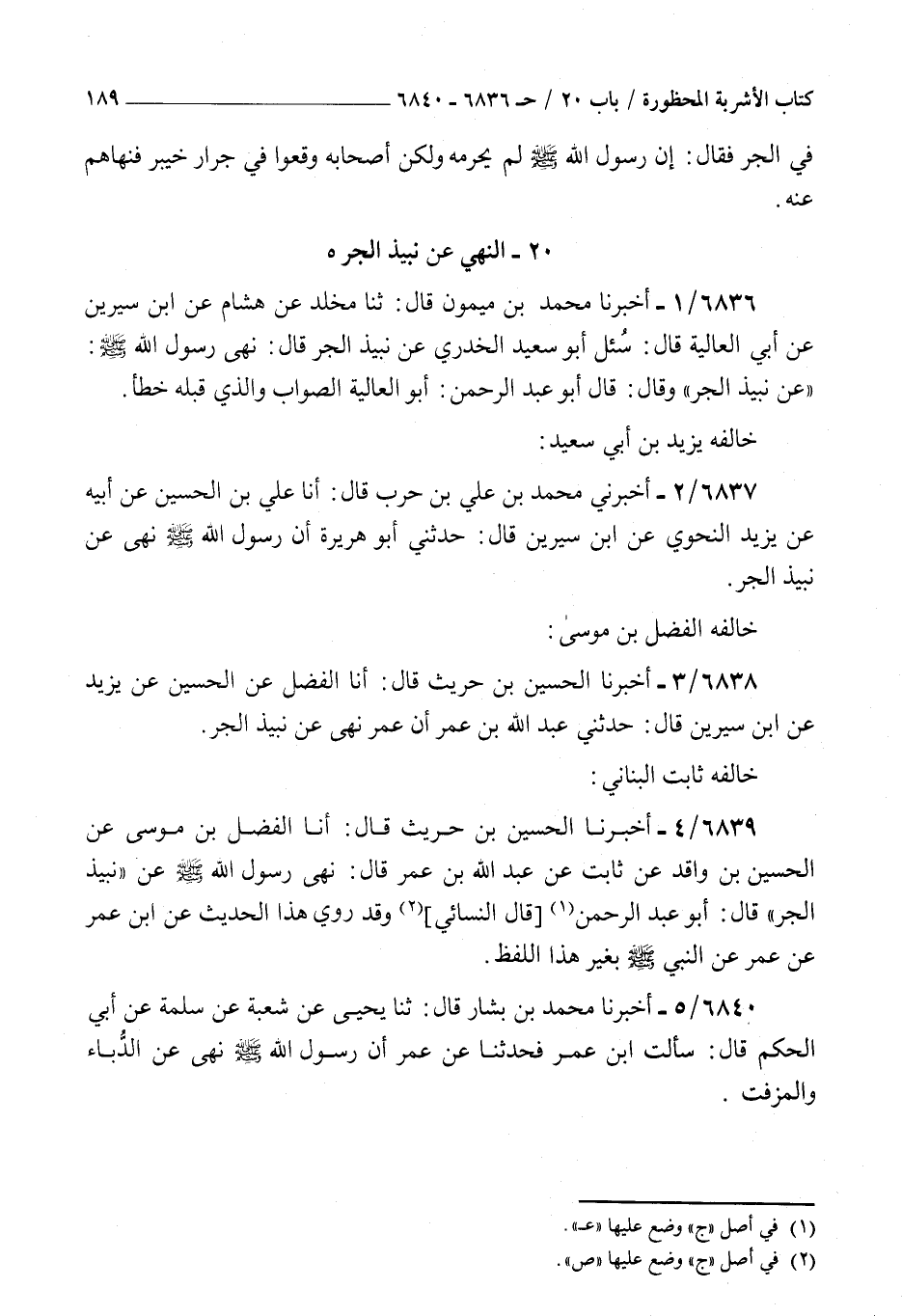 6837 - أخبرني محمد بن علي بن حرب قال أنا علي بن الحسين عن أبيه عن يزيد النحوي عن بن سيرين قال حدثني أبو هريرة : أن رسول الله صلى الله عليه و سلم نهى عن نبيذ الجر خالفه الفضل بن موسى