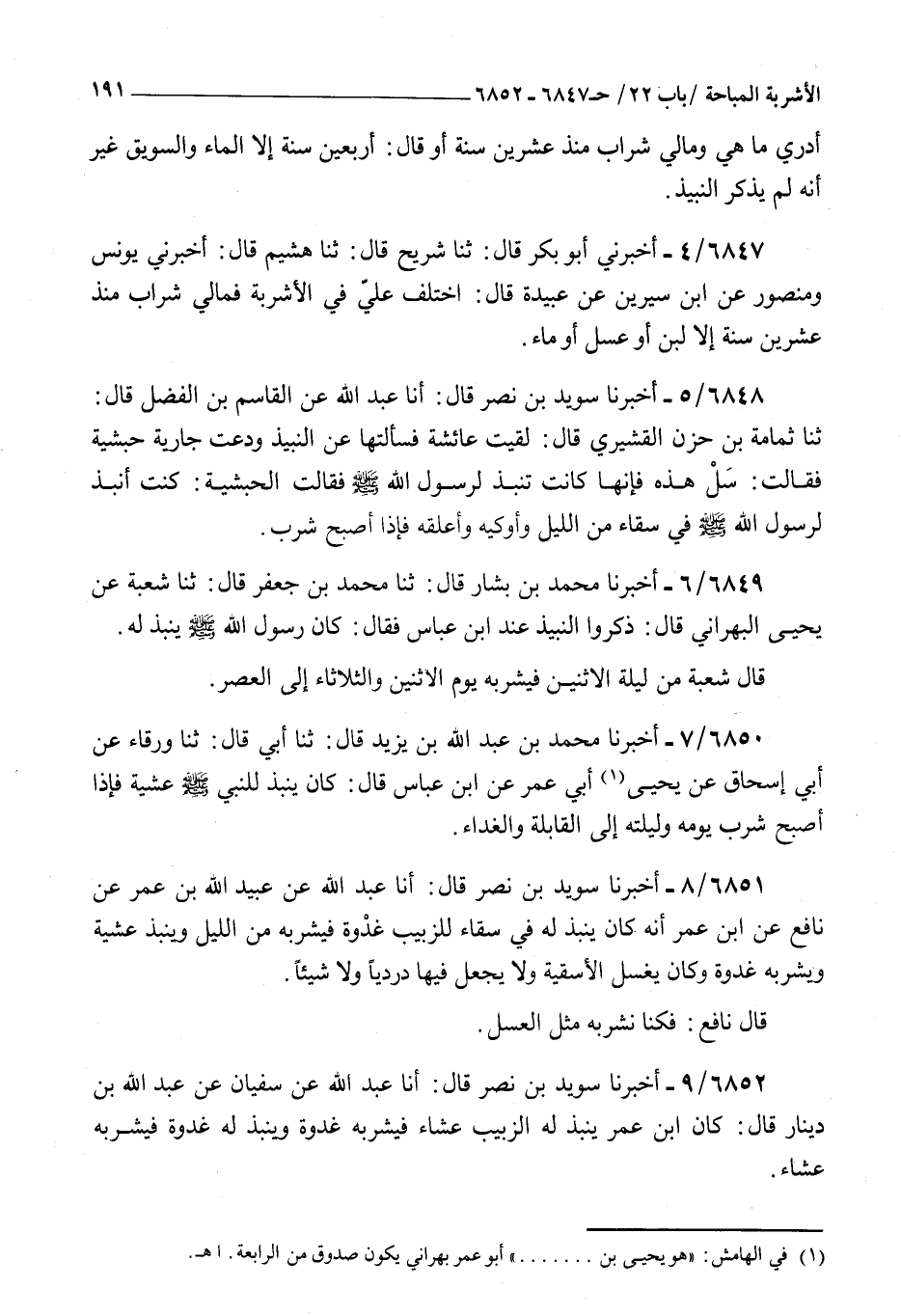 6852 - أخبرنا سويد بن نصر قال أنا عبد الله عن سفيان عن عبد الله بن دينار قال : كان بن عمر ينبذ له الزبيب عشاء فيشربه غدوة وينبذ له غدوة فيشربه عشاء