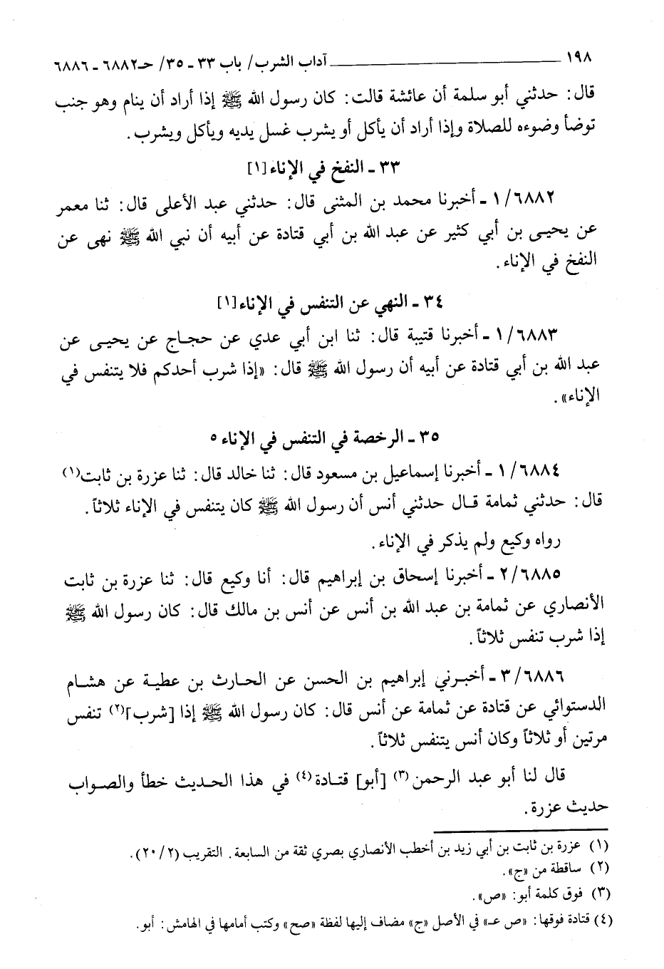 6886 - أخبرني إبراهيم بن الحسن عن الحارث بن عطية عن هشام الدستوائي عن قتادة عن ثمامة عن أنس قال : كان رسول الله صلى الله عليه و سلم إذا شرب تنفس مرتين أو ثلاثا وكان أنس يتنفس ثلاثا قال لنا أبو عبد الرحمن أبو قتادة في هذا الحديث خطأ والصواب حديث عزرة