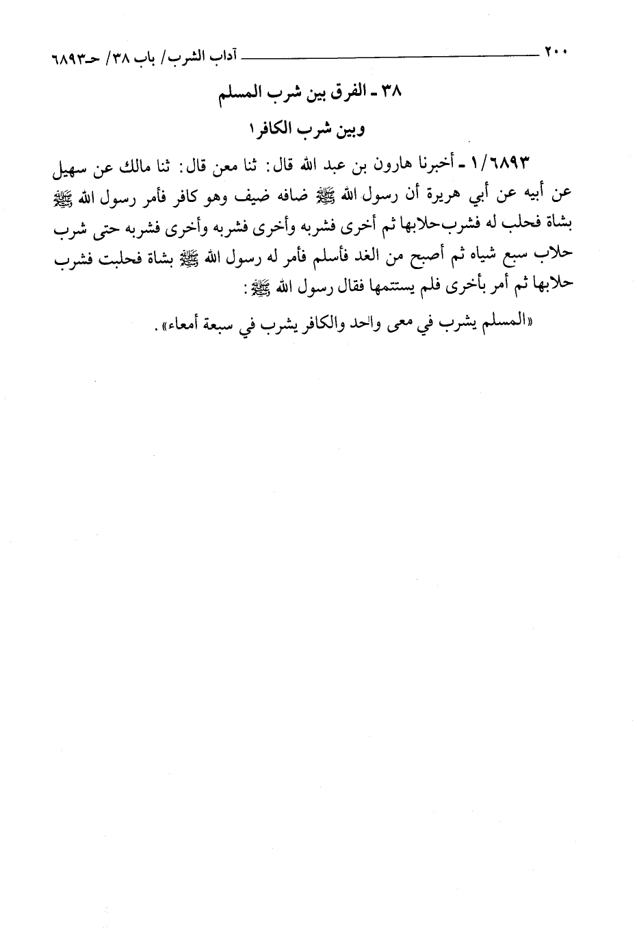 6893 - أخبرنا هارون بن عبد الله قال ثنا معن قال ثنا مالك عن سهيل عن أبي هريرة : أن رسول الله صلى الله عليه و سلم ضافه ضيف وهو كافر فأمر رسول الله صلى الله عليه و سلم بشاة فحلب له فشرب حلابها ثم أخرى فشربه وأخرى فشربه وأخرى فشربه حتى شرب حلاب سبع شياه ثم أصبح من الغد فأسلم فأمر له رسول الله صلى الله عليه و سلم بشاة فحلبت فشرب حلابها ثم أمر بأخرى فلم يستتمها فقال رسول الله صلى الله عليه و سلم المسلم يشرب في معي واحد والكافر يشرب في سبعة أمعاء [ ص 201 ] بسم الله الرحمن الرحيم