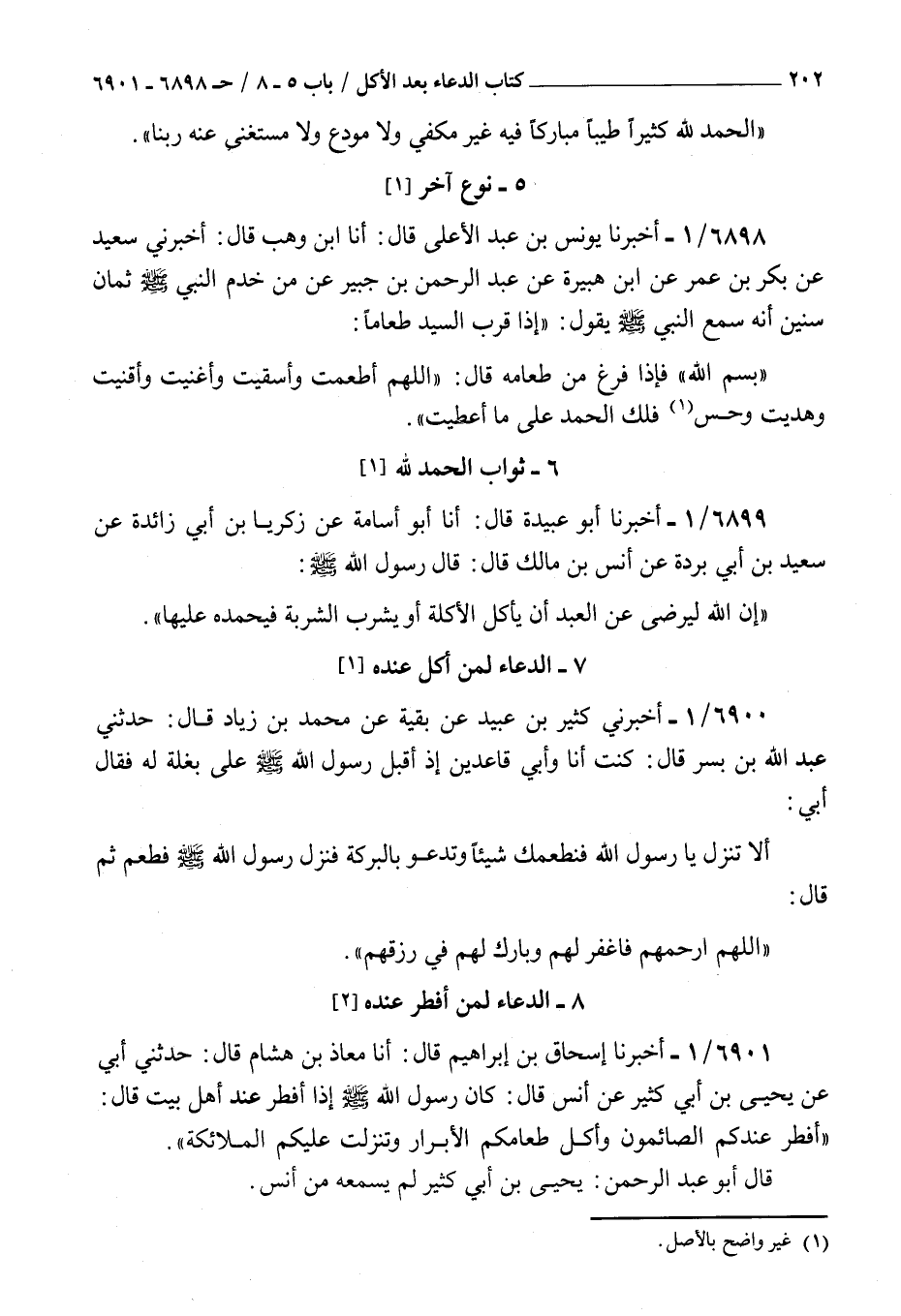 6900 - أخبرني كثير بن عبيد عن بقية عن محمد بن زياد قال حدثني عبد الله بن بسر قال : كنت أنا وأبي قاعدين إذ أقبل رسول الله صلى الله عليه و سلم على بغلة له فقال أبي ألا تنزل يا رسول الله فنطعمك شيئا وتدعو بالبركة فنزل رسول الله صلى الله عليه و سلم فطعم ثم قال اللهم ارحمهم فاغفر لهم وبارك لهم في رزقهم
