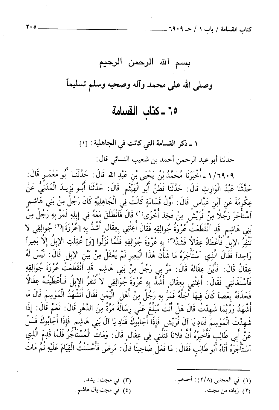 6909 - أخبرنا محمد بن يحيى بن عبد الله قال حدثنا أبو معمر قال حدثنا عبد الوارث قال حدثنا قطن أبو الهيثم قال حدثنا أبو يزيد المدني عن عكرمة عن بن عباس قال : أول قسامة كانت في الجاهلية كان رجل من بني هاشم استأجر رجلا من قريش من فخذ أخرى قال فانطلق معه في إبله فمر به رجل من بنى هاشم قد انقطعت عروة جوالقه فقال أغثني بعقال أشد به عروة جوالقي لا تنفر الإبل فأعطاه عقالا فشد به عروة جوالقه فلما نزلوا وعقلت الإبل إلا بعيرا واحدا فقال الذي استأجره ما شأن هذا البعير لم يعقل من بين الإبل قال ليس له عقال قال فأين عقاله قال مربي رجل من بني هاشم قد انقطعت عروة جوالقه فاستغاثني فقال أغثني بعقال أشد به عروة جوالقي لا تنفر الإبل فأعطيته عقالا فحذفه بعصا كان فيها أجله فمر به رجل من أهل اليمن فقال أتشهد الموسم قال ما أشهد وربما شهدت قال هل أنت مبلغ عني رسالة مرة من الدهر قال نعم قال إذا شهدت الموسم فناد يا آل قريش فإذا أجابوك فناد يا آل بني هاشم فإذا أجابوك فسل عن أبي طالب فأخبره أن فلانا قتلني في عقال قال ومات المستأجر فلما قدم الذي استأجره أتاه أبو طالب فقال ما فعل صاحبنا قال مرض فأحسنت القيام عليه ثم مات فوليت دفنه فقال كان ذا أهل ذلك منك فمكث حينا ثم إن الرجل اليماني الذي كان أوصى إليه أن يبلغ عنه وافي الموسم قال يا آل قريش قالوا هذه قريش قال يا آل بني هاشم قالوا هذه بنو هاشم قال أين أبو طالب قال هذا أبو طالب قال أمرني فلان أن أبلغك رسالة أن فلان قتله في عقال فأتاه أبو طالب فقال اختر منا إحدى ثلاث إن شئت أن تؤدي مائة من الإبل فإنك قتلت صاحبنا خطأ وأن شئت خلف خمسون من قومك أنك لم تقتله فإن أبيت قتلناك به فأتى قومه فذكر ذلك لهم فقالوا نحلف فأتته امرأة من بني هاشم كانت تحت رجل منهم قد ولدت له فقالت يا أبا طالب أحب أن تجيز ابني هذا رجلا من الخمسين ولا تصبر يمينه ففعل فأتاه رجل منهم فقال يا أبا طالب أردت خمسين رجلا أن يحلفوا مكان مائة من الإبل يصيب كل رجل بعيران فهذان بعيران فاقبلهما عني ولا تصبر يميني حيث تصبر الأيمان فقبلهما وجاء ثمانية وأربعون رجلا حلفوا قال بن عباس فوالذي نفسي بيده ما حال الحول ومن الثمانية والأربعين عين تطرف