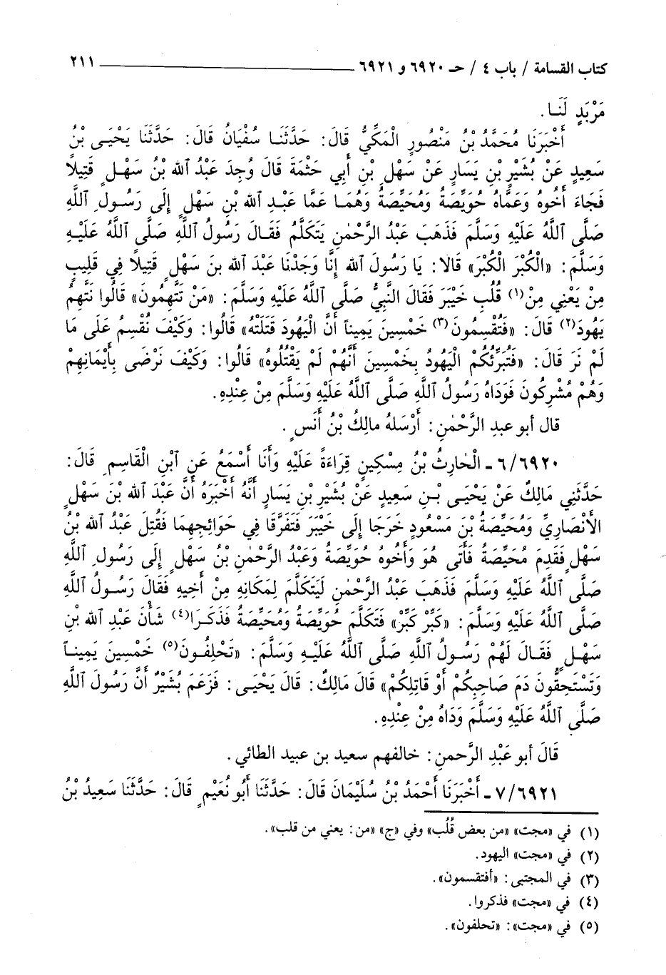 6920 - الحارث بن مسكين قراءة عليه وأنا أسمع عن بن القاسم قال حدثني مالك عن يحيى بن سعيد عن بشير بن يسار أنه أخبره : أن عبد الله بن سهل الأنصاري ومحيصة بن مسعود خرجا إلى خيبر فتفرقا في حوائجهما فقتل عبد الله بن سهل فقدم محيصة فأتى هو وأخوه حويصة وعبد الرحمن بن سهل إلى رسول الله صلى الله عليه و سلم فذهب عبد الرحمن ليتكلم لمكانه من أخيه فقال رسول الله صلى الله عليه و سلم كبر كبر فتكلم حويصة ومحيصة فذكرا شأن عبد الله بن سهل فقال لهم رسول الله صلى الله عليه و سلم تحلفون خمسين يمينا وتستحقون دم صاحبكم أو قاتلكم قال مالك قال يحيى فزعم بشير أن رسول الله صلى الله عليه و سلم وداه من عنده قال أبو عبد الرحمن خالفهم سعيد بن عبيد الطائي