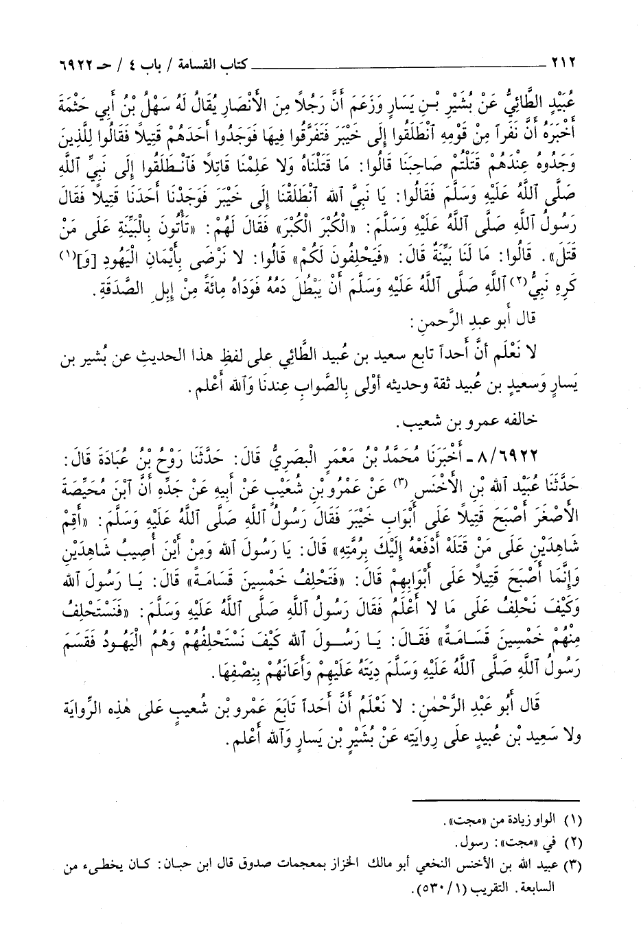 6922 - أخبرنا محمد بن معمر البصري قال حدثنا روح بن عبادة قال حدثنا عبيد الله بن الأخنس عن عمرو بن شعيب عن أبيه عن جده : أن بن محيصة الأصغر أصبح قتيلا على أبواب خيبر فقال رسول الله صلى الله عليه و سلم أقم شاهدين على من قتله أدفعه إليك برمته قال يا رسول الله ومن أين أصيب شاهدين وإنما أصبح قتيلا على أبوابهم قال فتحلف خمسين قسامة قال يا رسول الله وكيف نحلف على ما لا أعلم فقال رسول الله صلى الله عليه و سلم فنستحلف منهم خمسين قسامة فقال يا رسول الله كيف نستحلفهم وهم اليهود فقسم رسول الله صلى الله عليه و سلم ديته عليهم وأعانهم بنصفها قال أبو عبد الرحمن لا نعلم أن أحدا تابع عمرو بن شعيب على هذه الرواية ولا سعيد بن عبيد على روايته عن بشير بن يسار والله أعلم