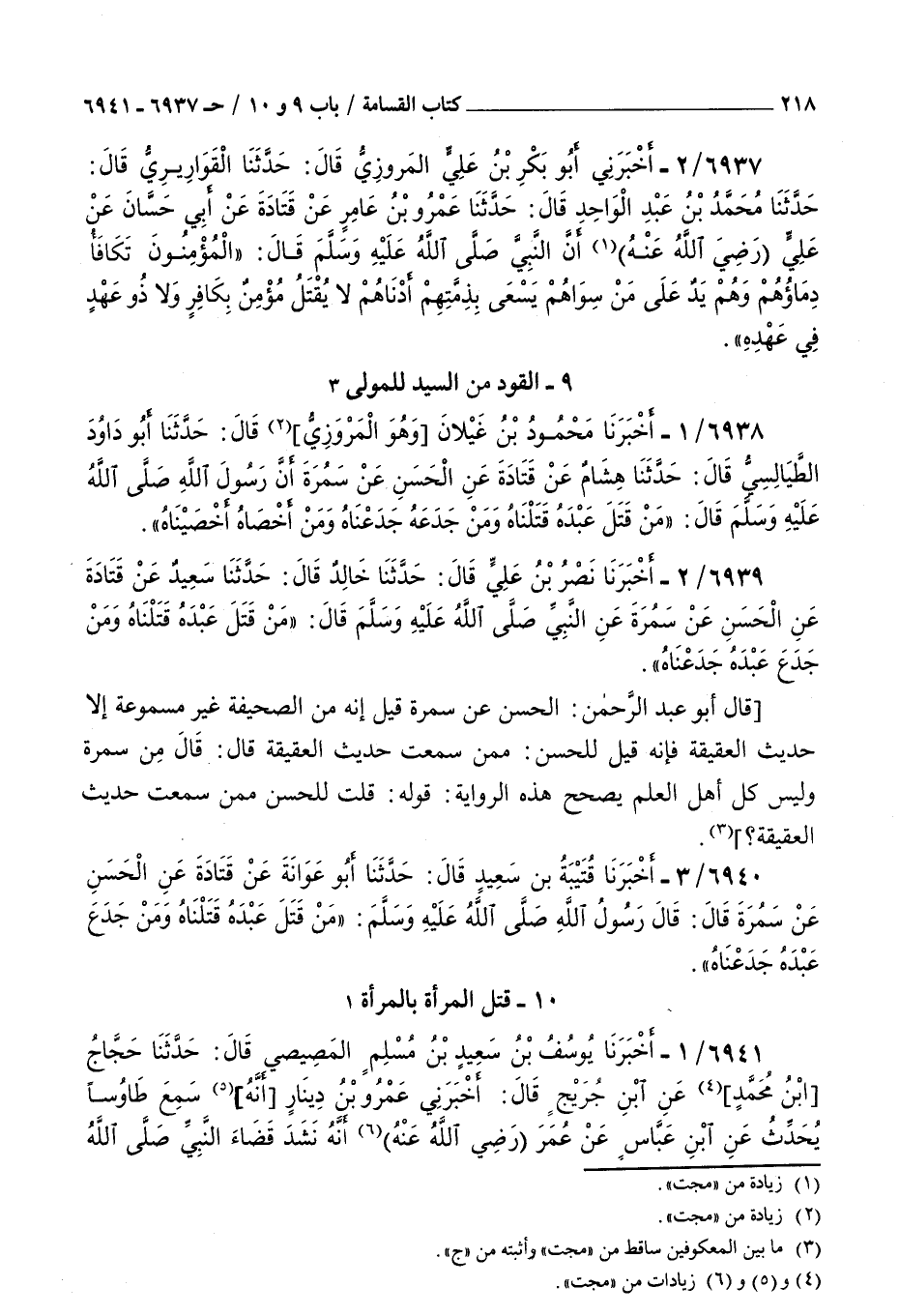 6937 - أخبرني أبو بكر بن علي المروزي قال حدثنا القواريري قال حدثنا محمد بن عبد الواحد قال حدثنا عمرو بن عامر عن قتادة عن أبي حسان عن علي رضي الله عنه أن النبي صلى الله عليه و سلم قال : المؤمنون تكافأ دماؤهم وهم يد على من سواهم يسعى بذمتهم أدناهم لا يقتل مؤمن بكافر ولا ذو عهد في عهده