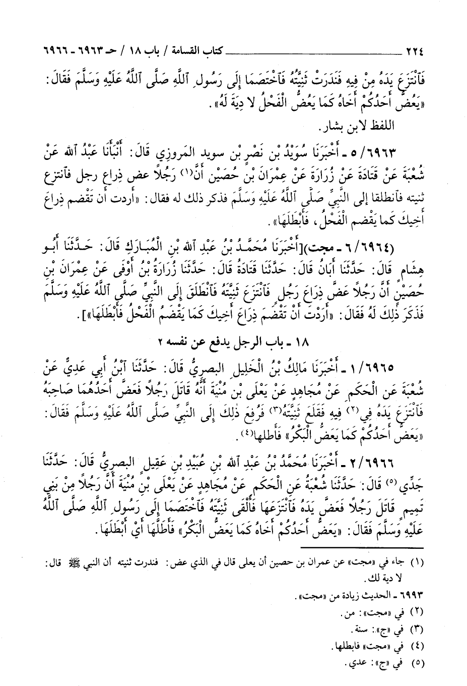 6963 - أخبرنا سويد بن نصر بن سويد المروزي قال أنبأنا عبد الله عن شعبة عن قتادة عن زرارة عن عمران بن حصين : أن رجلا عض ذراع رجل فانتزع ثنيته فانطلقا إلى النبي صلى الله عليه و سلم فذكر ذلك له فقال أردت أن تقضم ذراع أخيك كما يقضم الفحل فأبطلها
