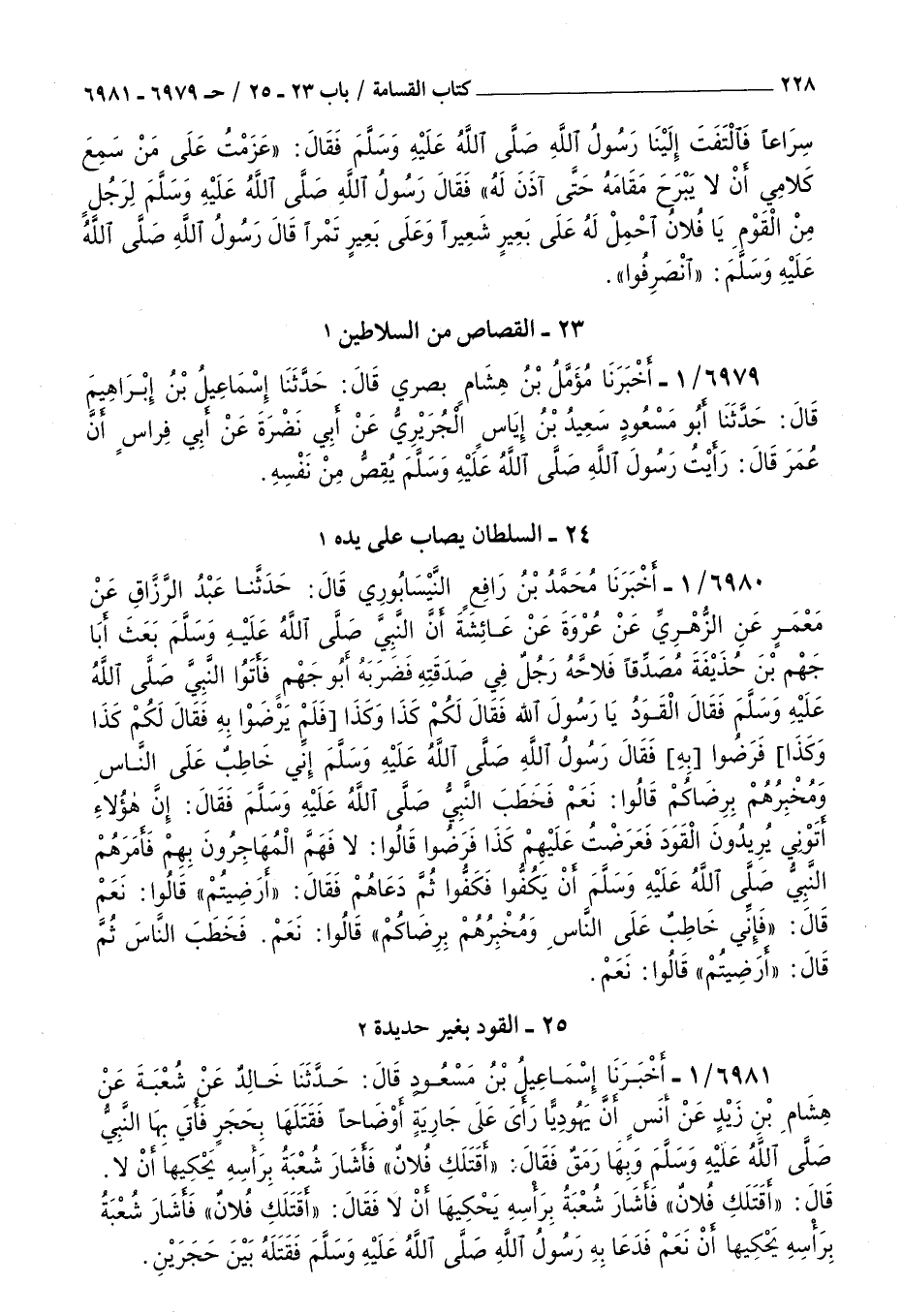 6981 - أخبرنا إسماعيل بن مسعود قال حدثنا خالد عن شعبة عن هشام بن زيد عن أنس : أن يهوديا رأى على جارية أوضاحا فقتلها بحجر فأتي بها النبي صلى الله عليه و سلم وبها رمق فقال أقتلك فلان فأشار شعبة برأسه يحكيها أن لا قال أقتلك فلان فأشار شعبة برأسه يحكيها أن لا فقال أقتلك فلان فأشار شعبة برأسه يحكيها أن نعم فدعا به رسول الله صلى الله عليه و سلم فقتله بين حجرين