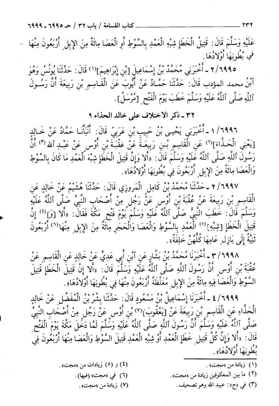 6996 - أخبرني يحيى بن حبيب بن عربي قال أنبأنا حماد عن خالد يعني الحذاء عن القاسم بن ربيعة عن عقبة بن أوس عن عبد الله أن رسول الله صلى الله عليه و سلم قال : ألا وإن قتيل الخطأ شبه العمد ما كان بالسوط والعصا مائة من الإبل أربعون في بطون أولادها