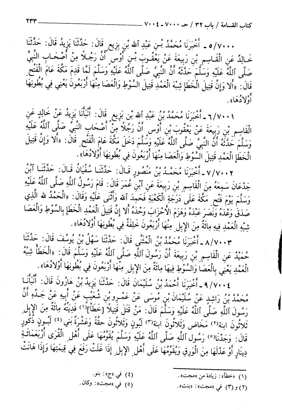 7000 - أخبرنا محمد بن عبد الله بن بزيع قال حدثنا يزيد قال حدثنا خالد عن القاسم بن ربيعة عن يعقوب بن أوس أن رجلا من أصحاب النبي صلى الله عليه و سلم حدثه : أن النبي صلى الله عليه و سلم لما قدم مكة عام الفتح قال إلا وإن قتيل الخطأ شبه العمد قتيل السوط والعصا منها أربعون يعني في بطونها أولادها