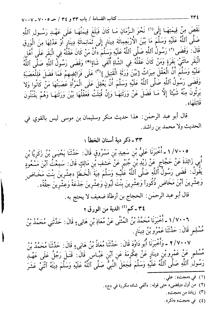 7005 - أخبرنا علي بن سعيد بن مسروق قال حدثنا يحيى بن زكريا بن أبي زائدة عن حجاج عن زيد بن جبير عن خشف بن مالك قال سمعت بن مسعود يقول : قضى رسول الله صلى الله عليه و سلم دية الخطأ عشرين بنت مخاض وعشرين بن مخاض ذكورا وعشرين بنت لبون وعشرين جذعة وعشرين حقة قال أبو عبد الرحمن الحجاج بن أرطأة ضعيف لا يحتج به