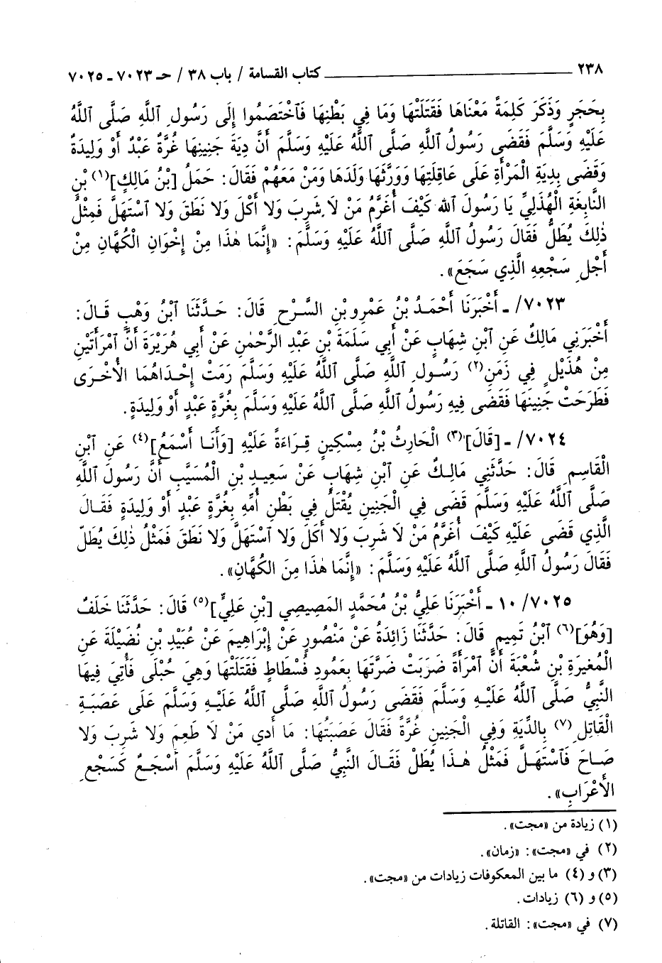 7025 - أخبرنا علي بن محمد المصيصي بن علي قال حدثنا خلف وهو بن تميم قال حدثنا زائدة عن منصور عن إبراهيم عن عبيد بن نضيلة عن المغيرة بن شعبة : أن امرأة ضربت ضرتها بعمود فسطاط فقتلتها وهي حبلى فأتي فيها النبي صلى الله عليه و سلم فقضى رسول الله صلى الله عليه و سلم على عصبة القاتل بالدية وفي الجنين غرة فقال عصبتها ما أدي من لا طعم ولا شرب ولا صاح فاستهل فمثل هذا يطل فقال النبي صلى الله عليه و سلم اسجع كسجع الأعراب