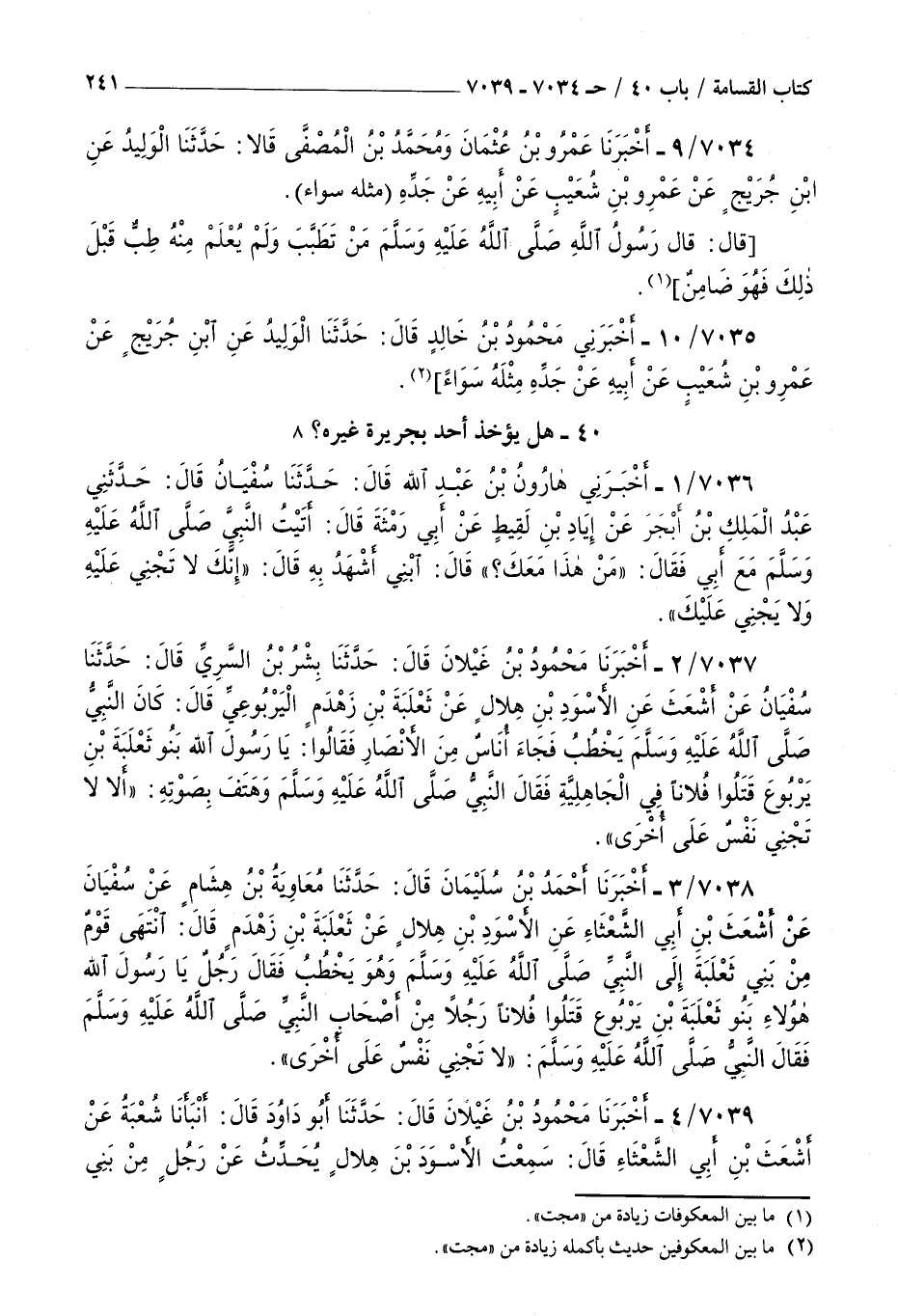 7039 - أخبرنا محمود بن غيلان قال حدثنا أبو داود قال أنبأنا شعبة عن أشعث بن أبي الشعثاء قال سمعت الأسود بن هلال يحدث عن رجل من بني ثعلبة بن يربوع : أن ناسا من بن ثعلبة أتوا النبي صلى الله عليه و سلم فقال رجل يا رسول الله هؤلاء بنو ثعلبة بن يربوع قتلوا فلانا رجلا من أصحاب النبي صلى الله عليه و سلم فقال النبي صلى الله عليه و سلم لا تجني نفس على أخرى