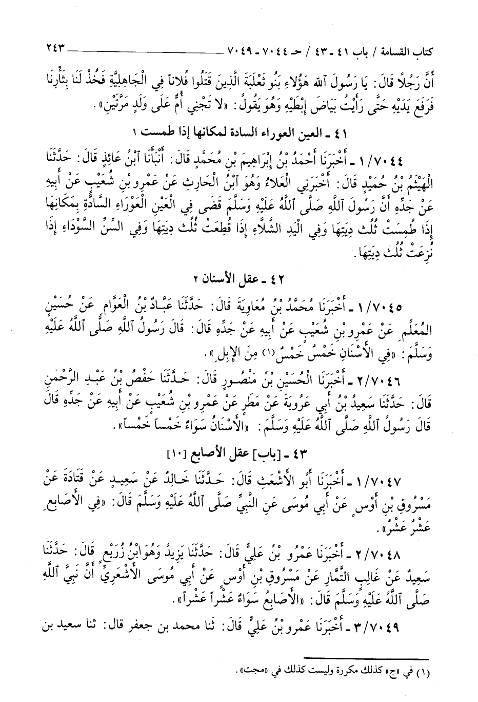 7045 - أخبرنا محمد بن معاوية قال حدثنا عباد بن العوام عن حسين المعلم عن عمرو بن شعيب عن أبيه عن جده قال قال رسول الله صلى الله عليه و سلم : في الأسنان خمس خمس من الإبل