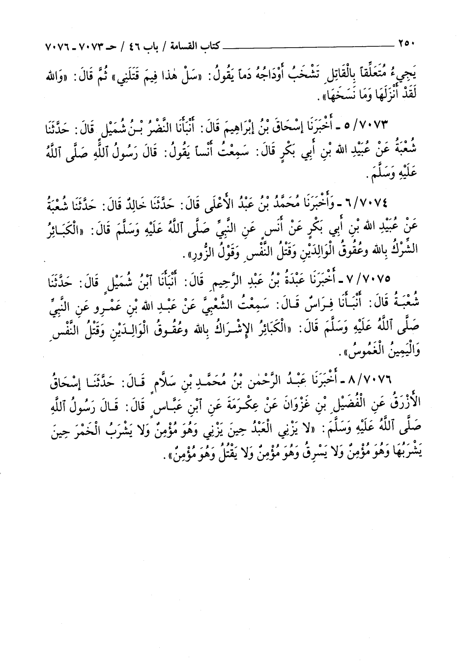 7074 - و أخبرنا محمد بن عبد الأعلى قال : حدثنا خالد قال : حدثنا شعبة عن عبيد الله بن أبي بكر عن أنس : عن النبي صلى الله عليه و سلم قال : الكبائر الشرك بالله وعقوق الوالدين وقتل النفس وقول الزور
