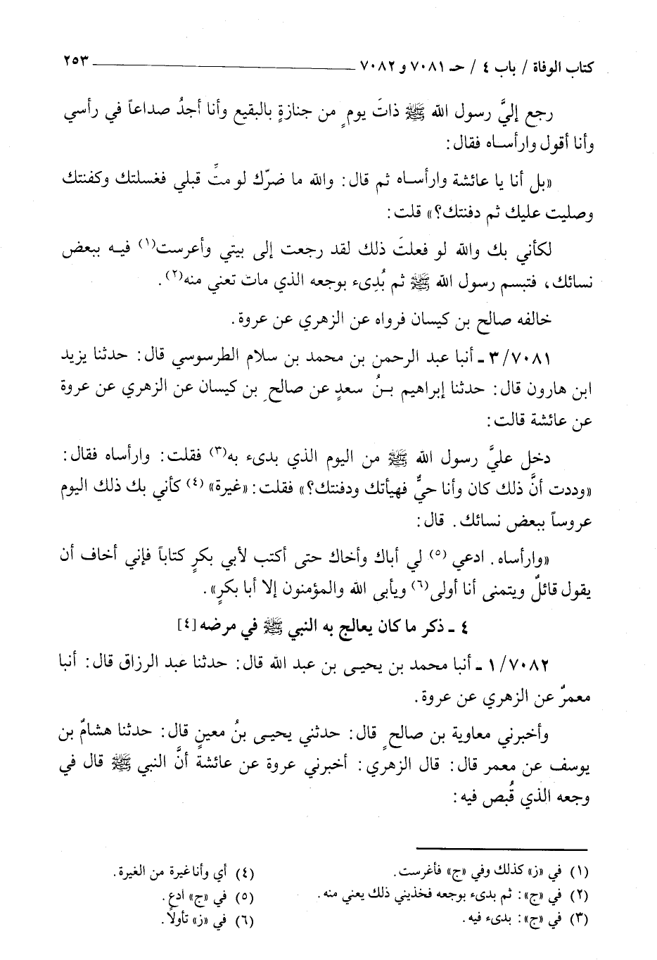 7081 - أنبأ عبد الرحمن بن محمد بن سلام الطرسوسي قال حدثنا يزيد بن هارون قال حدثنا إبراهيم بن سعد عن صالح بن كيسان عن الزهري عن عروة عن عائشة قالت : دخل علي رسول الله صلى الله عليه و سلم من اليوم الذي بدىء به فقلت وارأساه فقال وددت أن ذلك كان وأنا حي فهيأتك ودفنتك فقلت غيرة كأني بك ذلك اليوم عروسا ببعض نسائك قال وارأساه أدعي لي أباك وأخاك حتى أكتب لأبي بكر كتابا فإني أخاف أن يقول قائل ويتمنى أنا أولى ويأبى الله والمؤمنون إلا أبا بكر