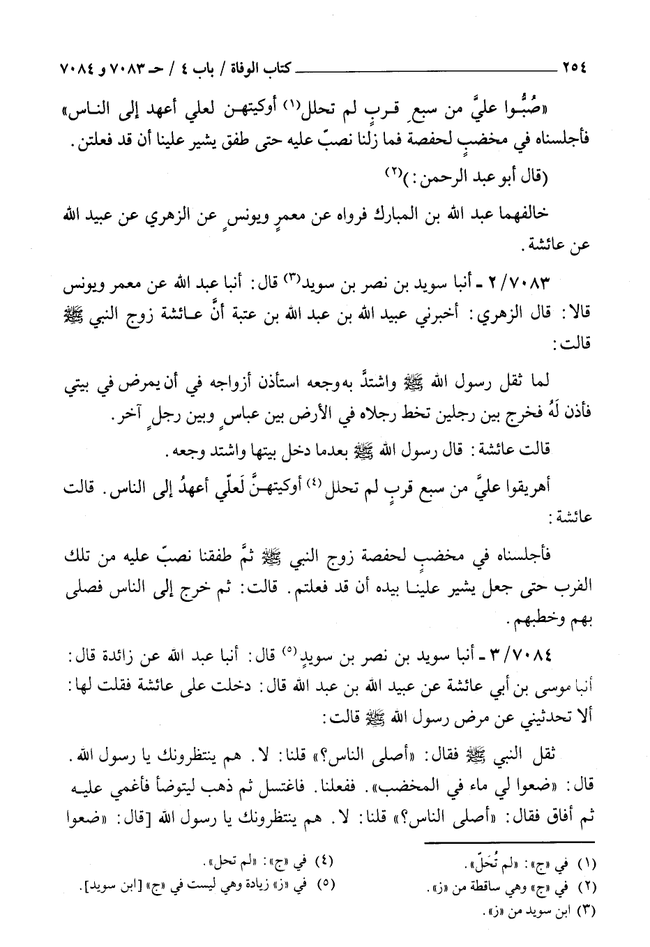 7083 - أنبأ سويد بن نصر بن سويد قال أنبأ عبد الله عن معمر ويونس قالا قال الزهري أخبرني عبيد الله بن عبد الله بن عتبة أن عائشة زوج النبي صلى الله عليه و سلم قالت : لما ثقل رسول الله صلى الله عليه و سلم واشتد به وجعه استأذن أزواجه في أن يمرض في بيتي فأذن له فخرج بين رجلين تخط رجلاه في الأرض بين عباس وبين رجل آخر قالت عائشة قال رسول الله صلى الله عليه و سلم بعدما دخل بيتها واشتد وجعه أهريقوا علي من سبع قرب لم تحلل أوكيتهن لعلي أعهد إلى الناس قالت عائشة فأجلسناه في مخضب لحفصة زوج النبي صلى الله عليه و سلم ثم طفقنا نصب عليه من تلك القرب حتى جعل يشير علينا بيده أن قد فعلتم قالت ثم خرج إلى الناس فصلى بهم وخطبهم