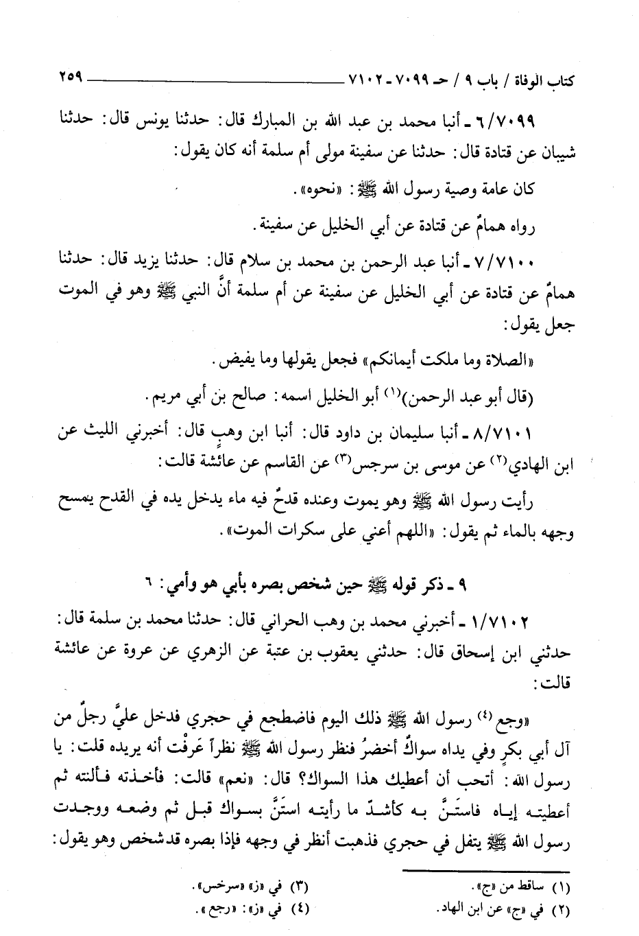 7100 - أنبأ عبد الرحمن بن محمد بن سلام قال حدثنا يزيد قال حدثنا همام عن قتادة عن أبي الخليل عن سفينة عن أم سلمة : أن النبي صلى الله عليه و سلم وهو في الموت جعل يقول الصلاة وما ملكت أيمانكم فجعل يقولها وما يفيض قال أبو عبد الرحمن أبو الخليل اسمه صالح بن أبي مريم