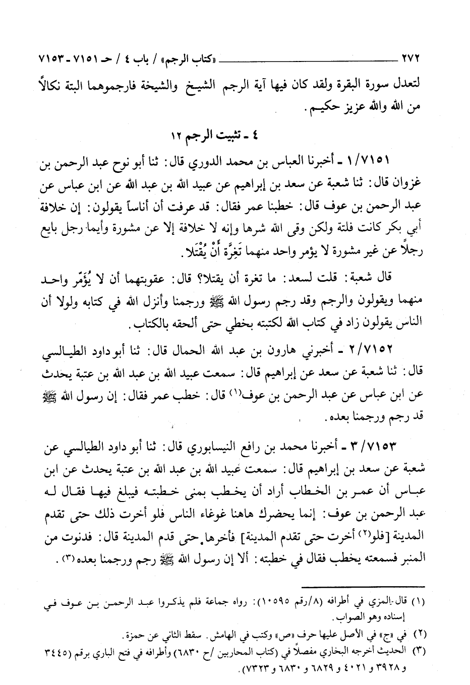 7151 - أخبرنا العباس بن محمد الدوري قال ثنا أبو نوح عبد الرحمن بن غزوان قال ثنا شعبة عن سعد بن إبراهيم عن عبيد الله بن عبد الله عن بن عباس عن عبد الرحمن بن عوف قال خطبنا عمر فقال : قد عرفت أن أناسا يقولون إن خلافة أبي بكر كانت فلتة ولكن وقى الله شرها وإنه لا خلافة إلا عن مشورة وأيما رجل بايع رجلا عن غير مشورة لا يؤمر واحد منهما تغرة أن يقتلا قال شعبة قلت لسعد ما تغرة أن يقتلا قال عقوبتهما أن لا يؤمر واحد منهما ويقولون والرجم وقد رجم رسول الله صلى الله عليه و سلم ورجمنا وأنزل الله في كتابه ولولا أن الناس يقولون زاد في كتاب الله لكتبته بخطي حتى ألحقه بالكتاب