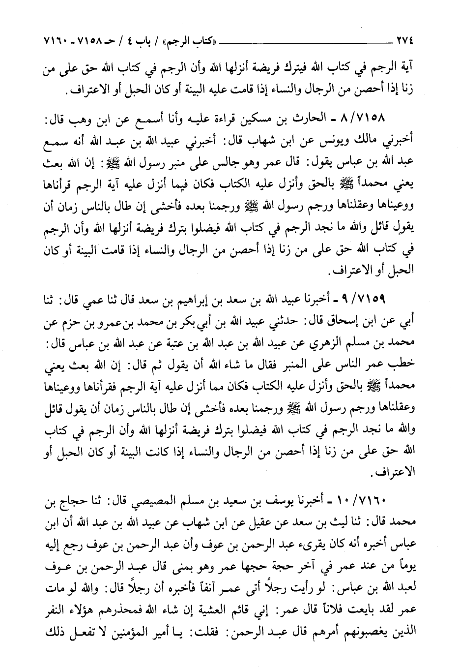 7158 - الحارث بن مسكين قراءة عليه وأنا أسمع عن بن وهب قال أخبرني مالك ويونس عن بن شهاب قال أخبرني عبيد الله بن عبد الله أنه سمع عبد الله بن عباس يقول قال عمر وهو جالس على منبر رسول الله صلى الله عليه و سلم : إن الله بعث يعني محمدا صلى الله عليه و سلم بالحق وأنزل عليه الكتاب فكان فيم أنزل عليه آية الرجم قرأناها ووعيناها وعقلناها ورجم رسول الله صلى الله عليه و سلم ورجمنا بعده فأخشى إن طال بالناس زمان أن يقول قائل والله ما نجد الرجم في كتاب الله فيضلوا بترك فريضة أنزلها الله وأن الرجم في كتاب الله حق على من زنا إذا أحصن من الرجال والنساء إذا قامت البينة أوكان الحبل أو الاعتراف