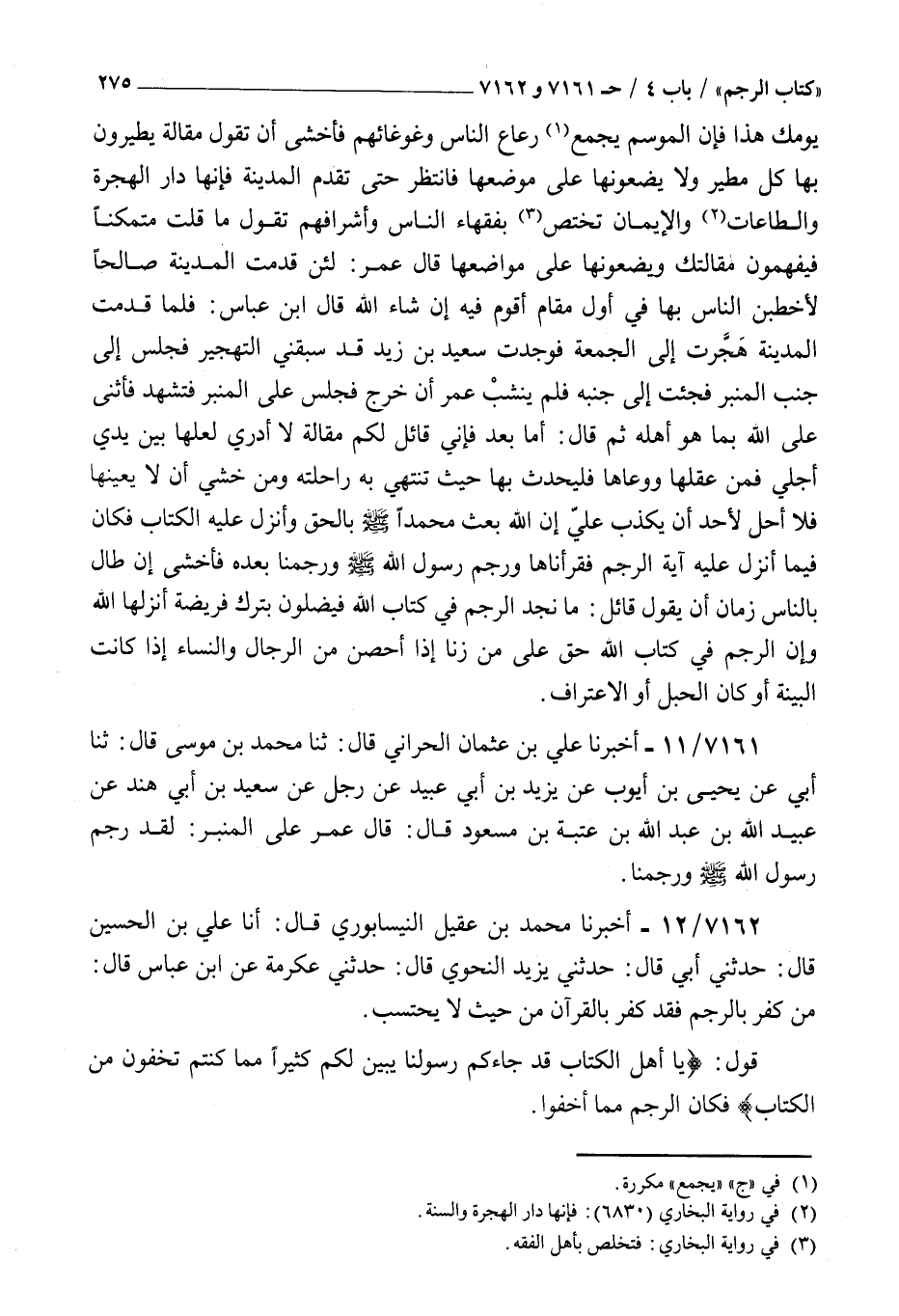 7161 - أخبرنا علي بن عثمان الحراني قال ثنا محمد بن موسى قال ثنا أبي عن يحيى بن أيوب عن يزيد بن أبي عبيد عن رجل عن سعيد بن أبي هند عن عبيد الله بن عبد الله بن عتبة بن مسعود قال قال عمر على المنبر : لقد رجم رسول الله صلى الله عليه و سلم ورجمنا