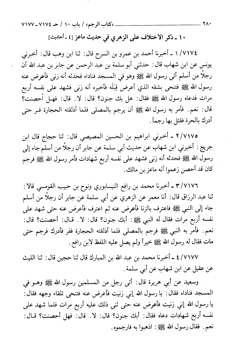7175 - أخبرني إبراهيم بن الحسين المصيصي قال ثنا حجاج قال بن جريج أخبرني بن شهاب عن حديث أبي سلمة عن جابر : أن رجلا من أسلم جاء إلى رسول الله صلى الله عليه و سلم فحدثه أنه زنى فشهد على نفسه أربع شهادات فأمر رسول الله صلى الله عليه و سلم فرجم كان قد أحصن زعموا أنه ماعز بن مالك