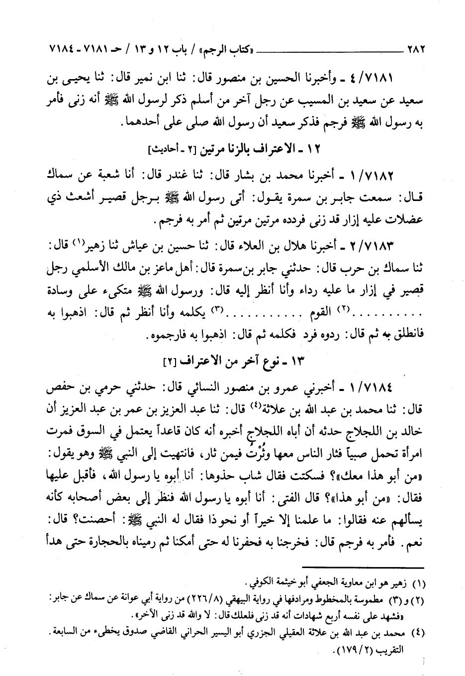 7182 - أخبرنا محمد بن بشار قال ثنا غندر قال أنا شعبة عن سماك قال سمعت جابر بن سمرة يقول : أتى رسول الله صلى الله عليه و سلم برجل قصير أشعث ذي عضلات عليه إزار قد زنى فردده مرتين مرتين ثم أمر به فرجم