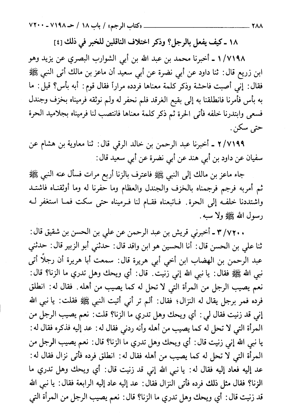 7200 - أخبرني قريش بن عبد الرحمن عن علي بن الحسن بن شقيق قال ثنا علي بن الحسن قال أنا الحسين هو بن واقد قال حدثني أبو الزبير قال حدثني عبد الرحمن بن الهضاب بن أخي أبي هريرة قال سمعت أبا هريرة أن رجلا أتى نبي الله صلى الله عليه و سلم فقال : يا نبي الله إني زنيت قال أي ويحك وهل تدري ما الزنا قال نعم يصيب الرجل من المرأة التي لا تحل له كما يصيب من أهله فقال له انطلق فرده فمر برجل يقال له النزال فقال ألم تر أني أتيت النبي صلى الله عليه و سلم فقلت يا نبي الله إني قد زنيت فقال لي أي ويحك وهل تدري ما الزنا قلت نعم يصيب الرجل من المرأة التي لا تحل له كما يصيب من أهله وإنه ردني فقال له عد إليه فذكره فقال له يا نبي الله إني زنيت قال أي ويحك وهل تدري ما الزنا قال نعم يصيب الرجل من المرأة التي لا تحل له كما يصيب من أهله فقال له انطلق فرده فأتى نزال فقال له عد إليه فعاد إليه فقال له يا نبي الله إن قد زنيت قال أي ويحك وهل تدري ما الزنا فقال مثل ذلك فرده فأتى النزال فقال عد إليه عاد إليه الرابعة فقال يا نبي الله قد زنيت قال أي ويحك وهل تدري ما الزنا قال نعم يصيب الرجل من المرأة التي لا تحل له كما يصيب من أهله فقال له هل أدخلت وأخرجت قال نعم قال النبي صلى الله عليه و سلم تبا لك سائر اليوم فأمر برجمه وقال أهلكه النزال ثلاثا قال فرجم فانتهى إلى أصل شجرة فاضطجع وتوسد يمينه حتى قتل فمر به رجلان من أصحاب النبي صلى الله عليه و سلم فقالا انظرا إلى هذا الذي أتى النبي صلى الله عليه و سلم كل ذلك يردده فأبى إلا أن يقتل قتل الكلب فسمع النبي صلى الله عليه و سلم فمر بحمار ميت شايل رجله فقال يا هذان تعاليا فكلا قالا يا نبي الله وهل أحد يأكل من هذا قال ما نلتما قبل من أخيكما كان أشد من هذا والذي نفسي بيده لقد رأيته بين أنهار الجنة يتغمس قال يعني يتنعم