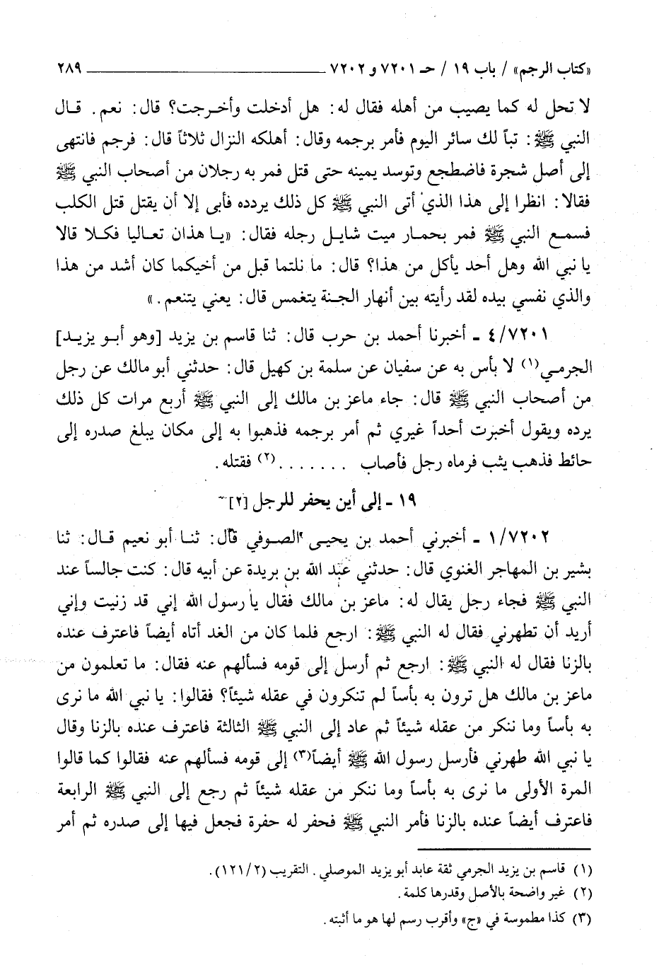 7201 - أخبرنا أحمد بن حرب قال ثنا قاسم بن يزيد وهو أبو يزيد الجرمي لا بأس به عن سفيان عن سلمة بن كهيل قال حدثني أبو مالك عن رجل من أصحاب النبي صلى الله عليه و سلم قال : جاء ماعز بن مالك إلى النبي صلى الله عليه و سلم أربع مرات كل ذلك يرده ويقول أخبرت أحدا غيري ثم أمر برجمه فذهبوا به إلى مكان يبلغ صدره إلى حائط فذهب يثب فرماه رجل فأصاب فقتله