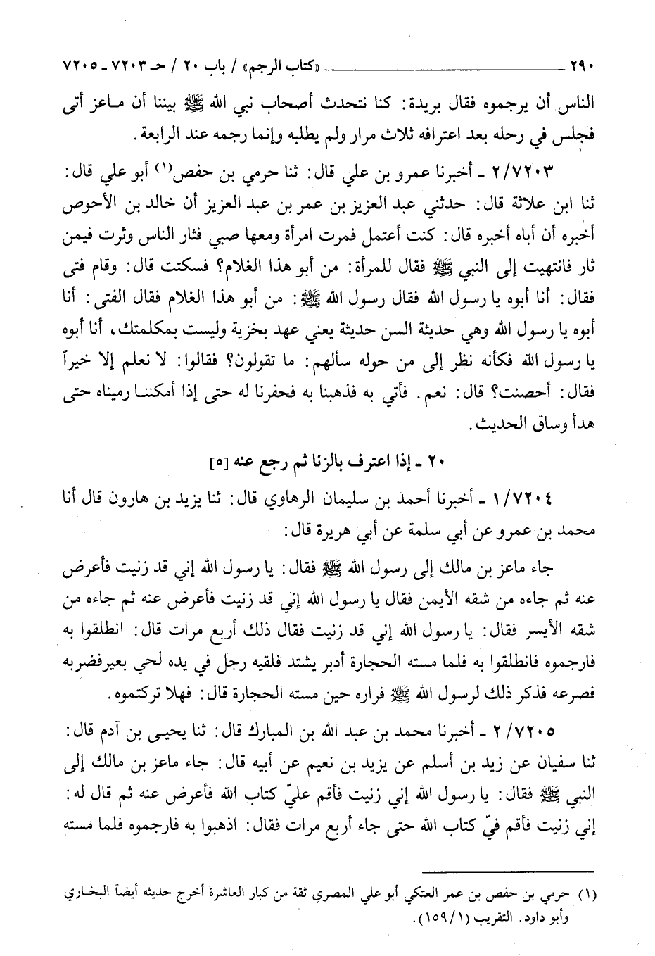 7203 - أخبرني عمرو بن علي قال ثنا حرمي بن حفص أبو علي قال ثنا بن علاثة قال حدثني عبد العزيز بن عمر بن عبد العزيز أن خالد بن الأحوص أخبره أن أباه أخبره قال : كنت أعتمل فمرت امرأة ومعها صبي فثار الناس وثرت فيمن ثار فانتهيت إلى النبي صلى الله عليه و سلم فقال للمرأة من أبو هذا الغلام فسكتت قال وقام فتى فقال أنا أبوه يا رسول الله فقال رسول الله صلى الله عليه و سلم من أبو هذا الغلام فقال الفتى أنا أبوه يا رسول الله وهي حديثة السن حديثة يعنى عهد بخزية وليست بمكلمتك أنا أبوه يا رسول الله فكأنه نظر إلى من حوله سألهم ما تقولون فقالوا لا نعلم إلا خيرا فقال أحصنت قال نعم فأتي به فذهبنا به فحفرنا له حتى إذا أمكننا رميناه حتى هدأ وساق الحديث