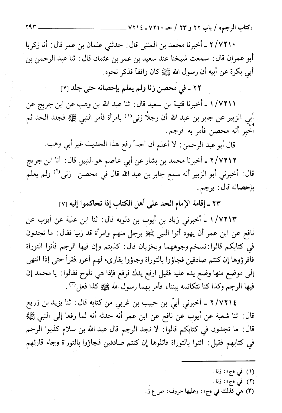 7213 - أخبرني زياد بن أيوب بن دلويه قال ثنا بن علية عن أيوب عن نافع عن بن عمر : أن يهود أتوا النبي صلى الله عليه و سلم برجل منهم وامرأة قد زنيا فقال ما تجدون في كتابكم قالوا نسخم وجوههما ويخزيان قال كذبتم وإن فيها الرجم فأتوا التوراة فاقرؤوها إن كنتم صادقين فجاؤوا بالتوراة وجاؤوا بقارىء لهم أعور فقرأ حتى إذا انتهى إلى موضع منها وضع يده عليه فقيل ارفع يدك فرفع فإذا هي تلوح فقالوا يا محمد إن فيها الرجم وكذا كنا نتكاتمه بيننا فأمر بهما رسول الله صلى الله عليه و سلم كذا فعل