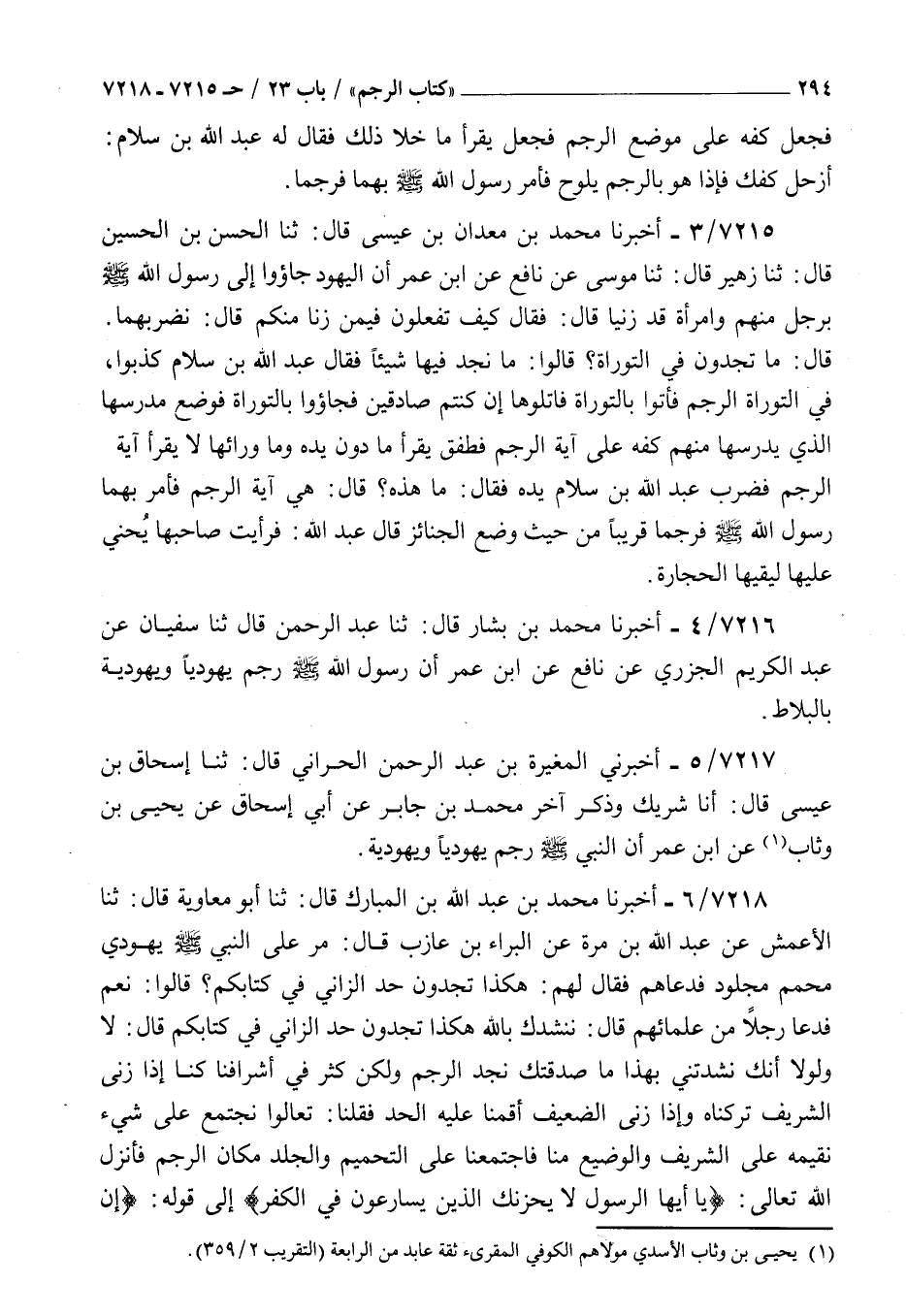 7217 - أخبرني المغيرة بن عبد الرحمن الحراني قال ثنا إسحاق بن عيسى قال أنا شريك وذكر آخر محمد بن جابر عن أبي إسحاق عن يحيى بن وثاب عن بن عمر : أن النبي صلى الله عليه و سلم رجم يهوديا ويهودية