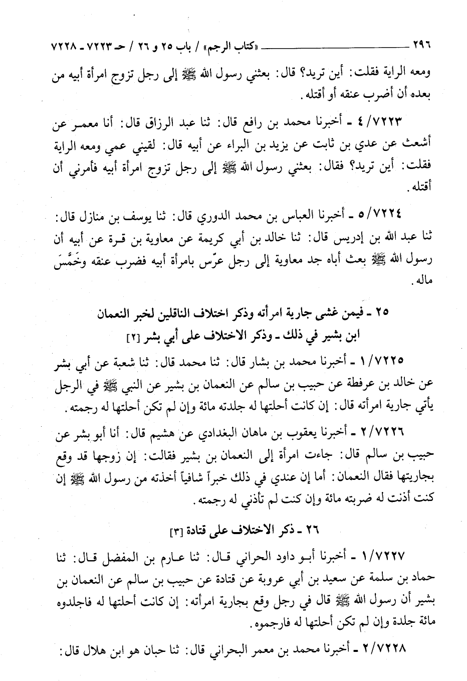 7226 - أخبرنا يعقوب بن ماهان البغدادي عن هشيم قال أنا أبو بشر عن حبيب بن سالم : قال جاءت امرأة إلى النعمان بن بشير فقالت إن زوجها قد وقع بجاريتها فقال النعمان أما إن عندي في ذلك خبرا شافيا أخذته من رسول الله صلى الله عليه و سلم إن كنت أذنت له ضربته مائة وإن كنت لم تأذني له رجمته