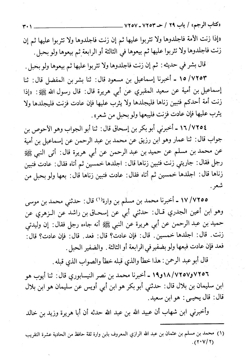 7254 - أخبرني أبو بكر بن إسحاق قال ثنا أبو الجواب وهو الأحوص بن جواب قال ثنا عمار وهو بن رزيق عن محمد بن عبد الرحمن عن إسماعيل بن أمية عن محمد بن مسلم عن حميد بن عبد الرحمن عن أبي هريرة قال : أتى النبي صلى الله عليه و سلم رجل فقال جاريتي زنت فتبين زناها قال اجلدها خمسين ثم أتاه فقال عادت فتبين زناها قال اجلدها خمسين ثم أتاه فقال عادت فتبين زناها قال بعها ولو بحبل من شعر
