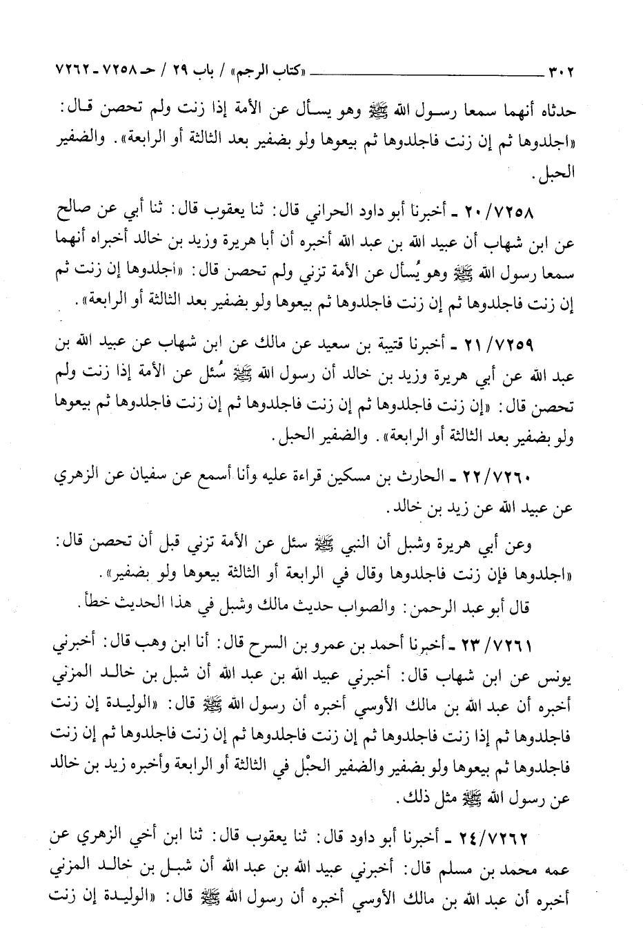 7259 - أخبرنا قتيبة بن سعيد عن مالك عن بن شهاب عن عبيد الله بن عبد الله عن أبي هريرة وزيد بن خالد : أن رسول الله صلى الله عليه و سلم سئل عن الأمة إذا زنت ولم تحصن قال إن زنت فاجلدوها ثم إن زنت فاجلدوها ثم إن زنت فاجلدوها ثم بيعوها ولو بضفير بعد الثالثة أو الرابعة والضفير الحبل