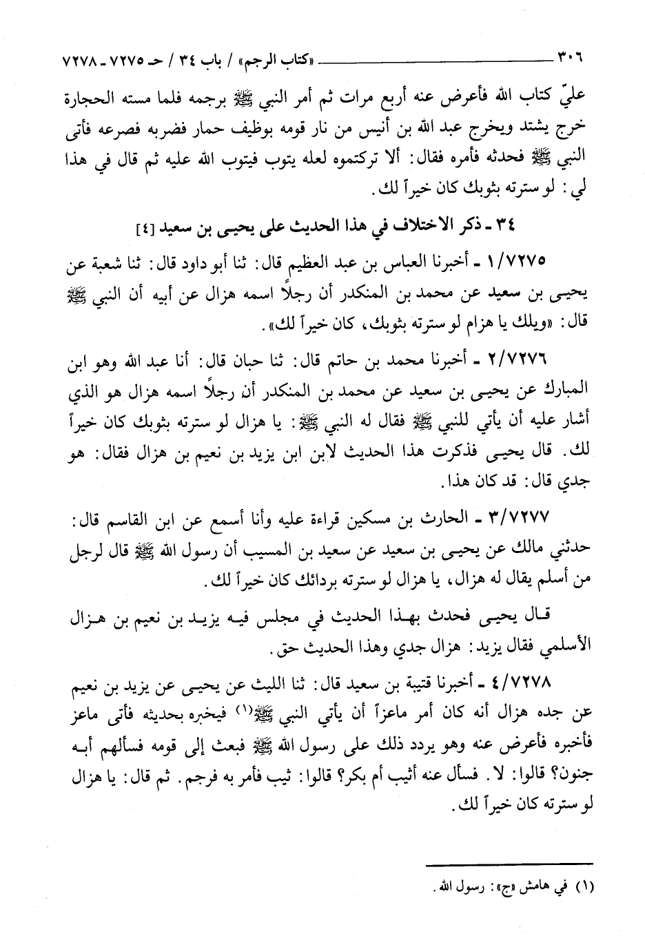 7276 - أخبرنا محمد بن حاتم قال ثنا حبان قال أنا عبد الله وهو بن المبارك عن يحيى بن سعيد عن محمد بن المنكدر : أن رجلا اسمه هزال هو الذي أشار عليه أن يأتي للنبي صلى الله عليه و سلم فقال له النبي صلى الله عليه و سلم يا هزال لو سترته بثوبك كان خيرا قال يحيى فذكرت هذا الحديث لابن بن يزيد بن نعيم بن هزال فقال هو جدي قال قد كان هذا