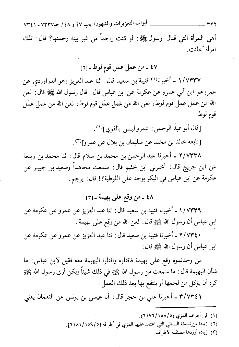 7339 - أخبرنا قتيبة بن سعيد قال ثنا عبد العزيز عن عمرو عن عكرمة عن بن عباس أن رسول الله صلى الله عليه و سلم قال : لعن الله من وقع على بهيمة