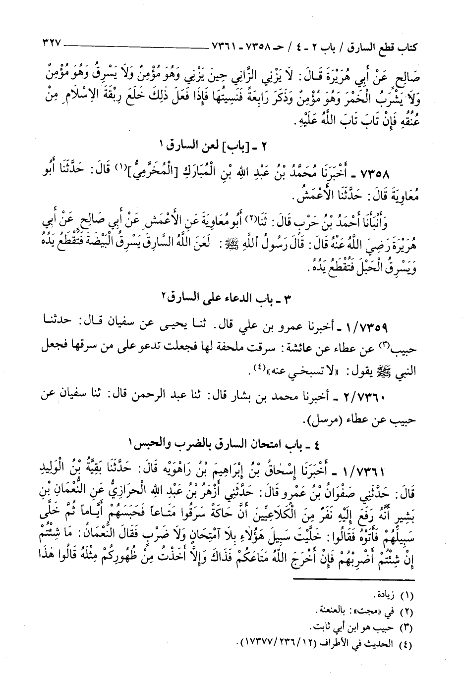 7358 - أخبرنا محمد بن عبد الله بن المبارك المخرمي قال حدثنا أبو معاوية قال حدثنا الأعمش وأنبأنا أحمد بن حرب قال ثنا أبو معاوية عن الأعمش عن أبي صالح عن أبي هريرة رضي الله عنه قال قال رسول الله صلى الله عليه و سلم : لعن الله السارق يسرق البيضة فتقطع يده ويسرق الحبل فتقطع يده