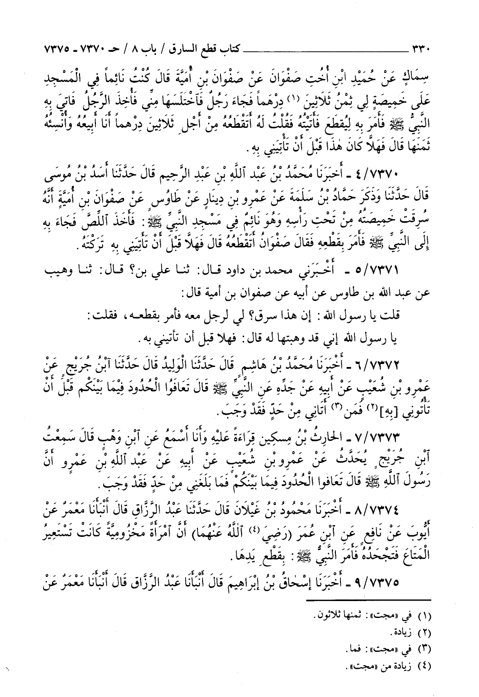 7370 - أخبرنا محمد بن عبد الله بن عبد الرحيم قال حدثنا أسد بن موسى قال حدثنا وذكر حماد بن سلمة عن عمرو بن دينار عن طاوس عن صفوان بن أمية أنه : سرقت خميصته من تحت رأسه وهو نائم في مسجد النبي صلى الله عليه و سلم فأخذ اللص فجاء به إلى النبي صلى الله عليه و سلم فأمر بقطعه فقال صفوان أتقطعه قال فهلا قبل أن تأتيني به تركته