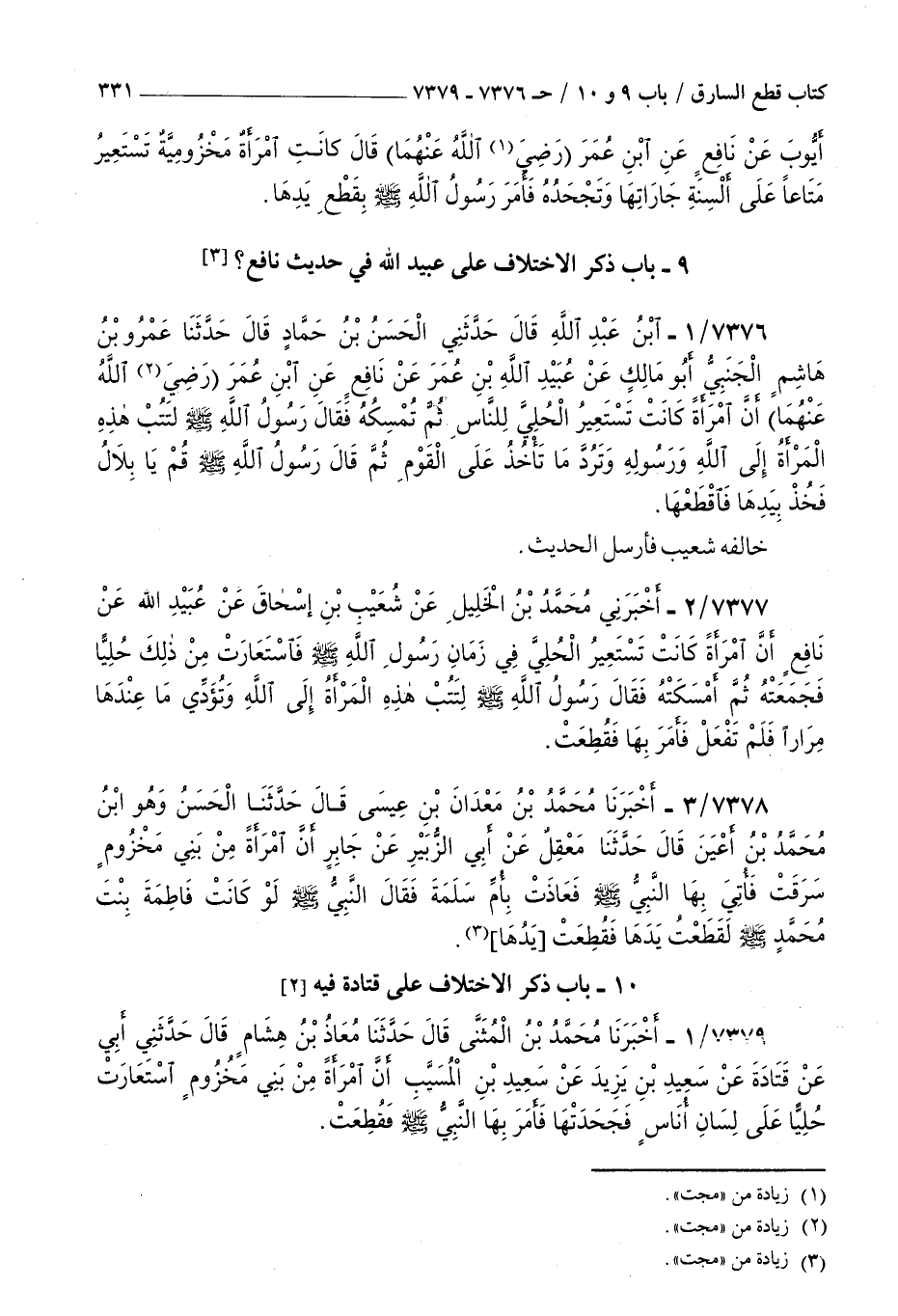7377 - أخبرني محمد بن الخليل عن شعيب بن إسحاق عن عبيد الله عن نافع : أن امرأة كانت تستعير الحلي في زمان رسول الله صلى الله عليه و سلم فاستعارت من ذلك حليا فجمعته ثم أمسكته فقال رسول الله صلى الله عليه و سلم لتتب هذه المرأة إلى الله وتؤدي ما عندها مرارا فلم تفعل فأمر بها فقطعت